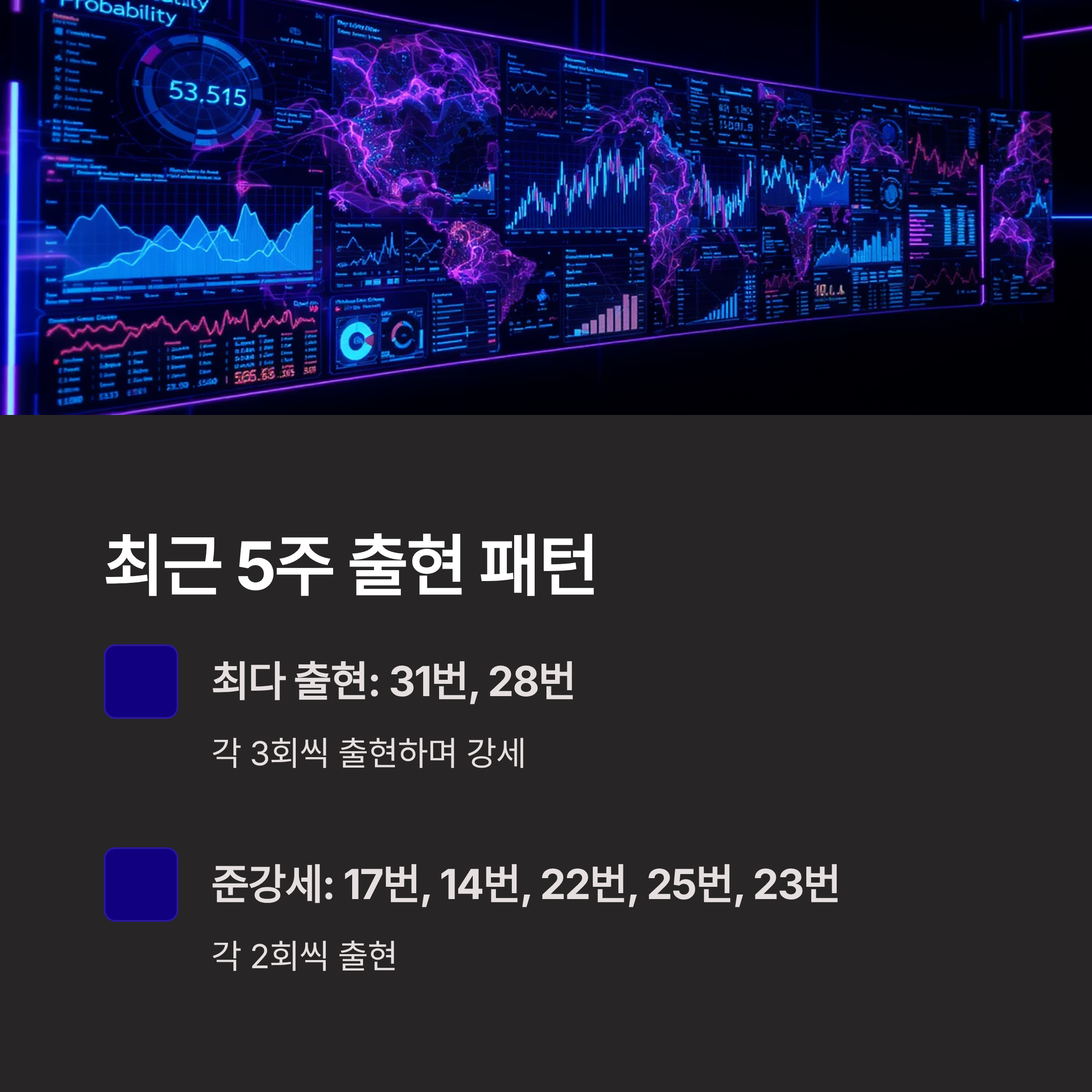5주간 당첨횟수 3회를 기록한 31번과 28번은 통계적으로 가장 강력한 후보로 분석됩니다. 또한 2회 출현한 17번, 14번, 22번, 25번, 23번도 높은 확률의 유력한 예상수로 평가됩니다.