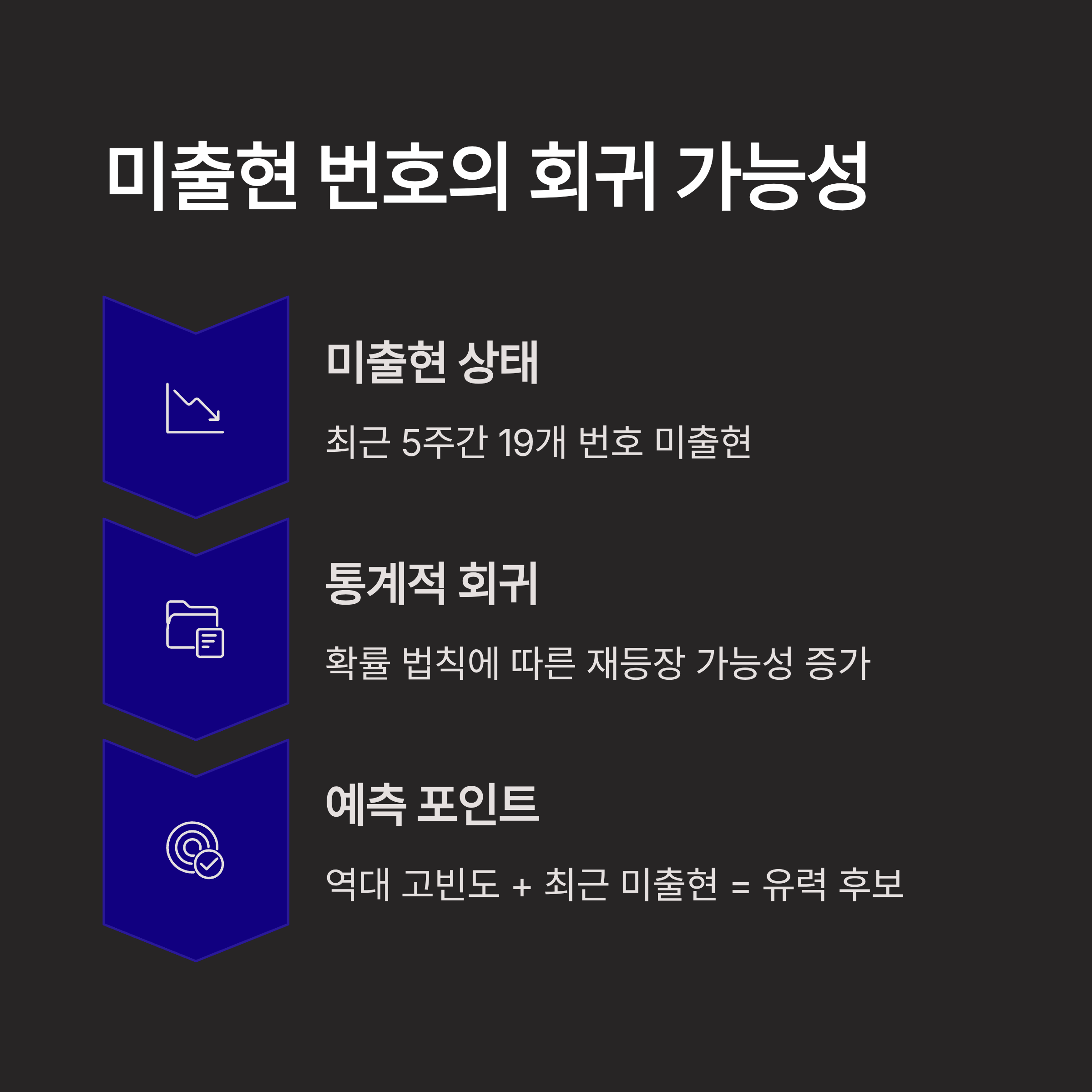이러한 미출현 번호들은 향후 당첨번호 선택 시 핵심적인 고려 요소가 됩니다. 특히 역대 당첨횟수가 많은 번호임에도 최근 미출현 상태인 번호들은 통계적 회귀 법칙에 따라 재등장 가능성이 높다고 분석됩니다.