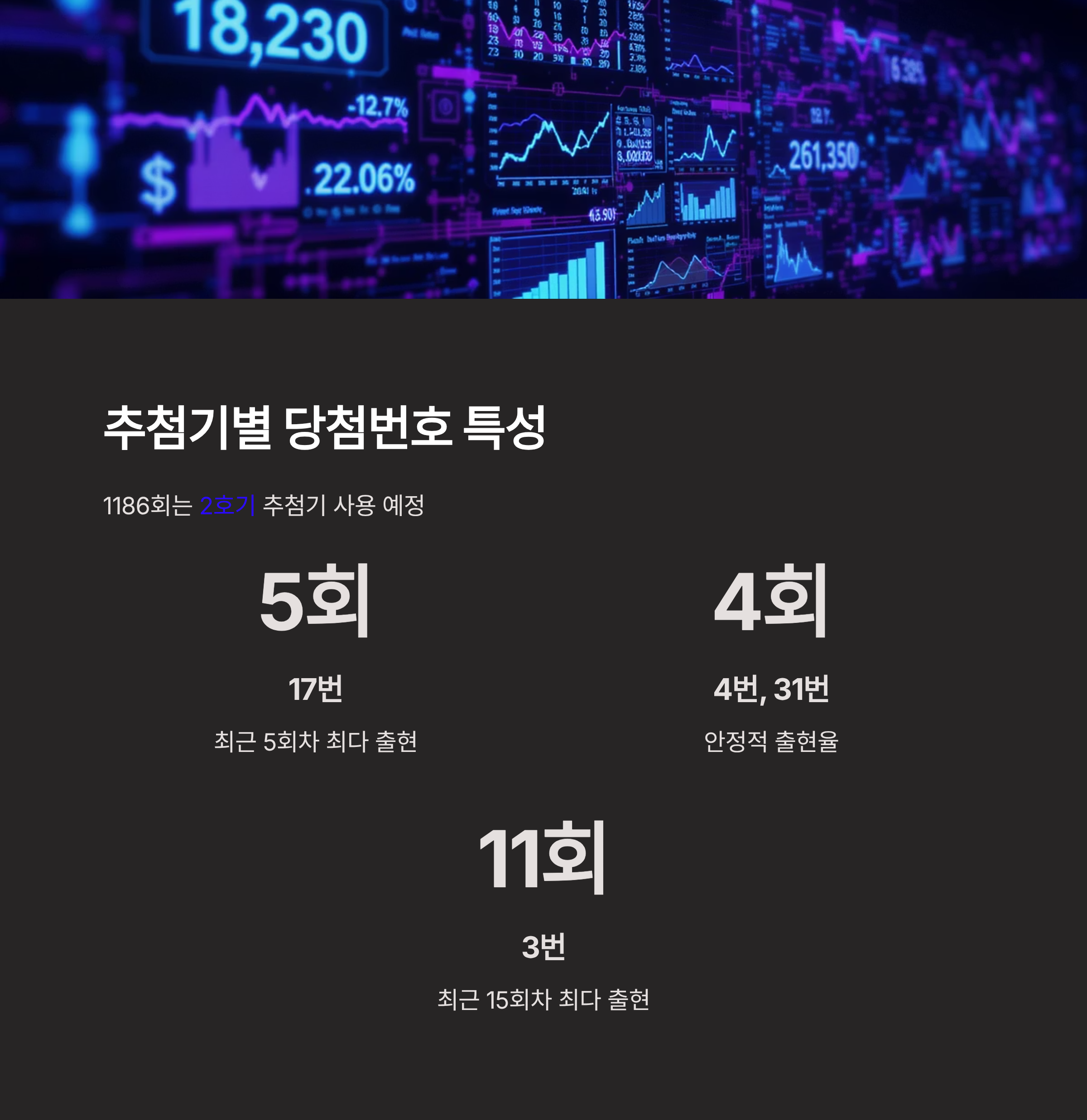 1186회 추첨에서는 2호기가 사용될 예정입니다. 2호기 추첨기에서만 나온 번호 중 최근 5회차까지의 출현횟수를 분석하면, 17번이 5회로 압도적인 최고 빈도를 보였고, 4번과 31번이 각각 4회씩 안정적인 출현율을 기록했습니다.
