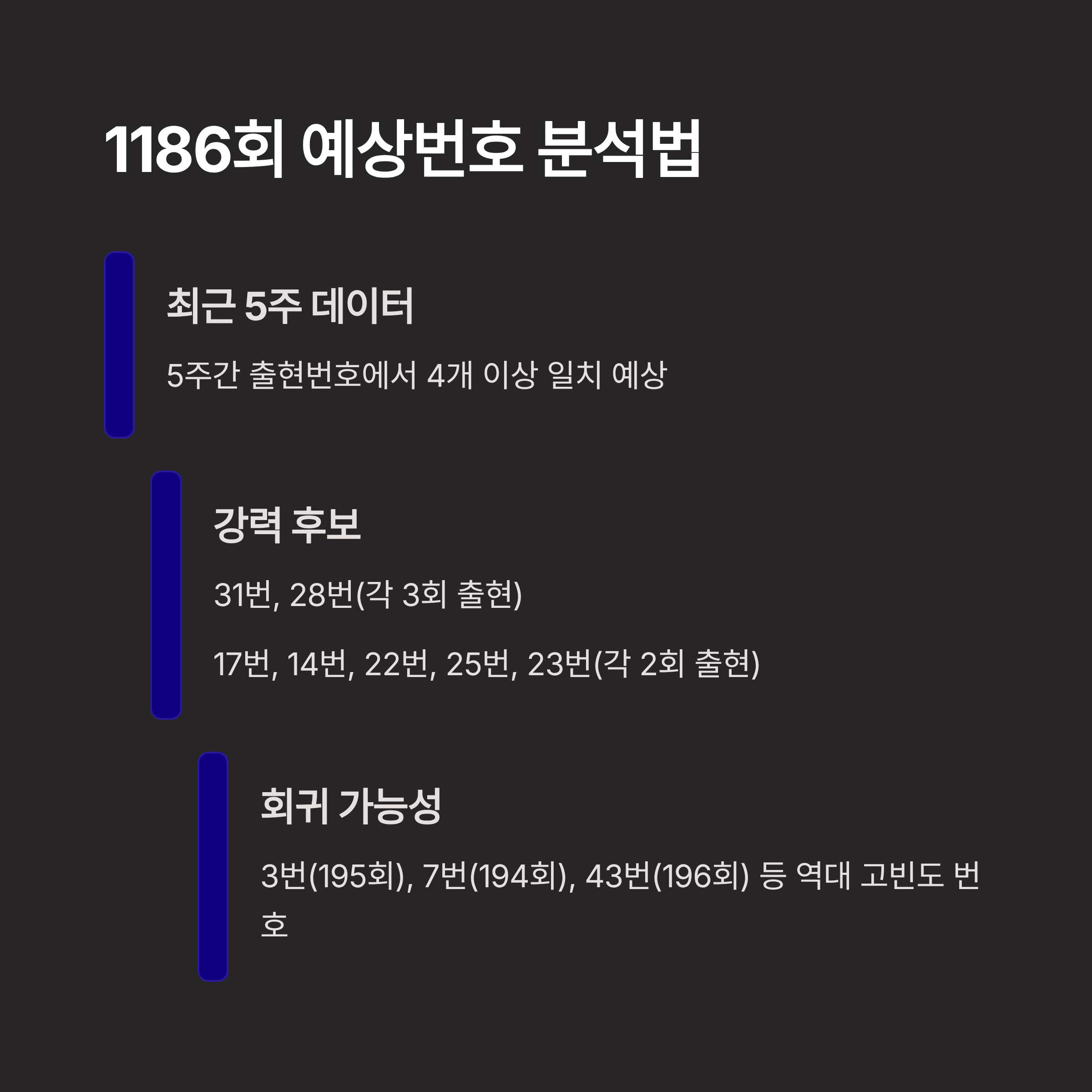 1186회 예상번호 조합 예시로는 17, 28, 31, 3, 7, 22 를 데이터 기반으로 제안합니다.