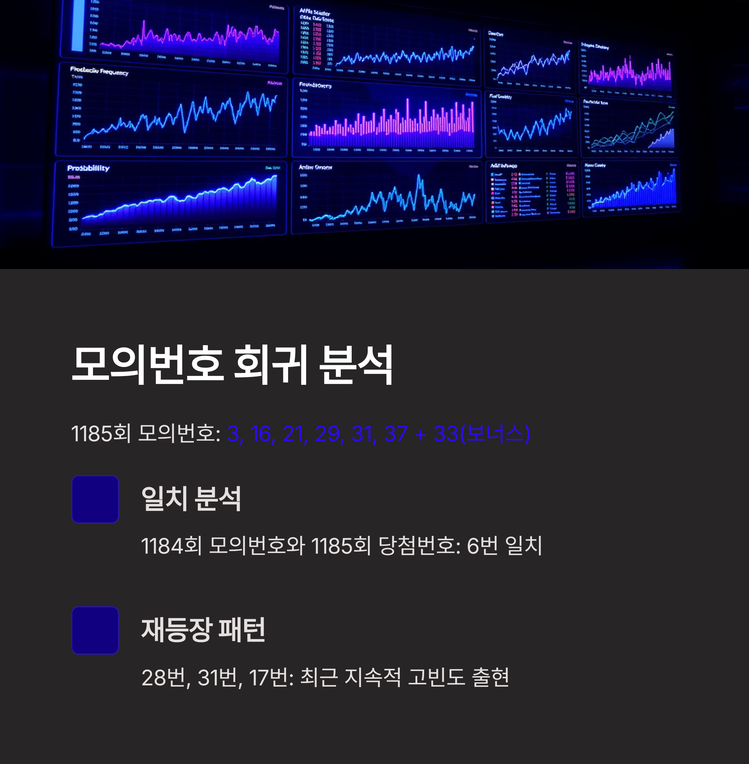 1185회 모의번호는 3번, 16번, 21번, 29번, 31번, 37번 + 33번(보너스)였습니다. 이 중 일부 번호가 1186회에 회귀 법칙에 따라 재등장할 통계적 가능성을 면밀히 고려해야 합니다.