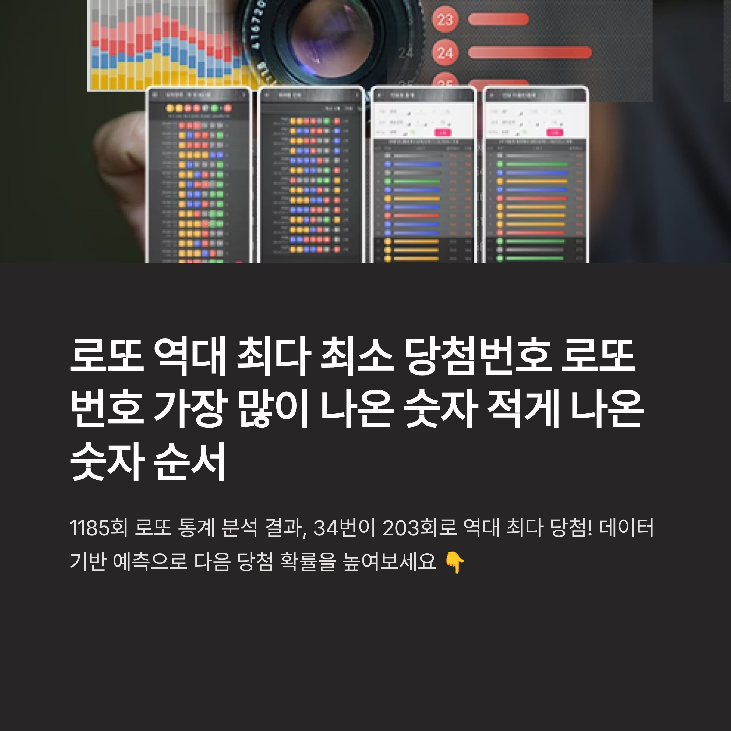 1185회 로또 당첨번호 통계에서 34번이 203회로 역대 최다 당첨번호를 기록했으며, 9번이 152회로 최소 당첨번호를 나타내고 있습니다. 이러한 로또 역대 최다 최소 당첨번호 데이터는 단순한 숫자가 아닌, 로또번호 가장 많이 나온 숫자와 적게 나온 숫자의 명확한 패턴을 보여주는 중요한 지표입니다.