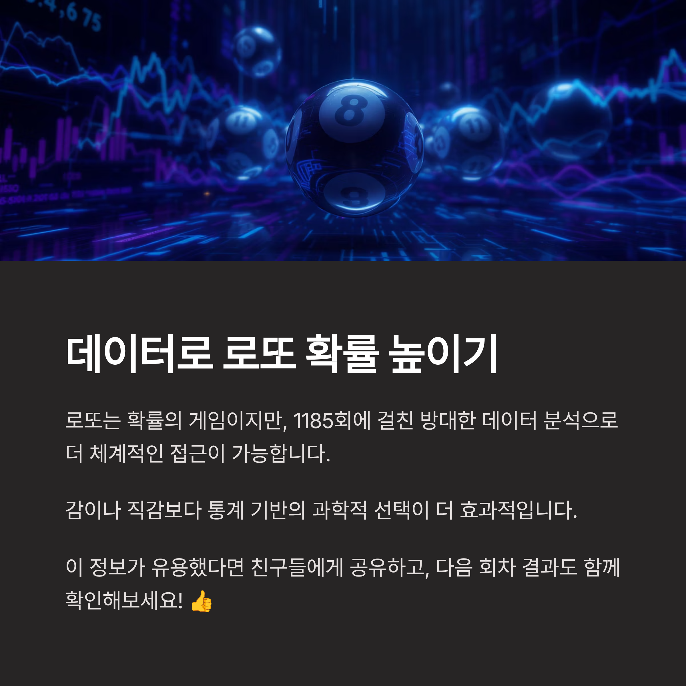 결국 로또는 확률의 게임이지만, 1185회에 걸친 방대한 과거 데이터에 기반한 통계적 분석을 통해 훨씬 체계적이고 합리적인 접근이 충분히 가능합니다.