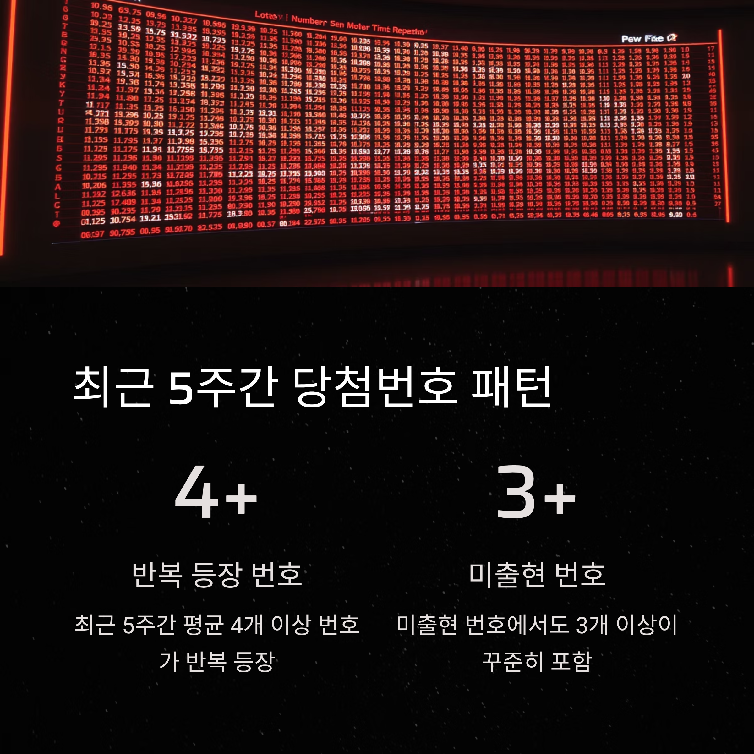 최근 5주간 당첨번호에서는 평균적으로 4개 이상이 반복 등장했고, 미출현번호에서도 3개 이상이 꾸준히 포함되었습니다.