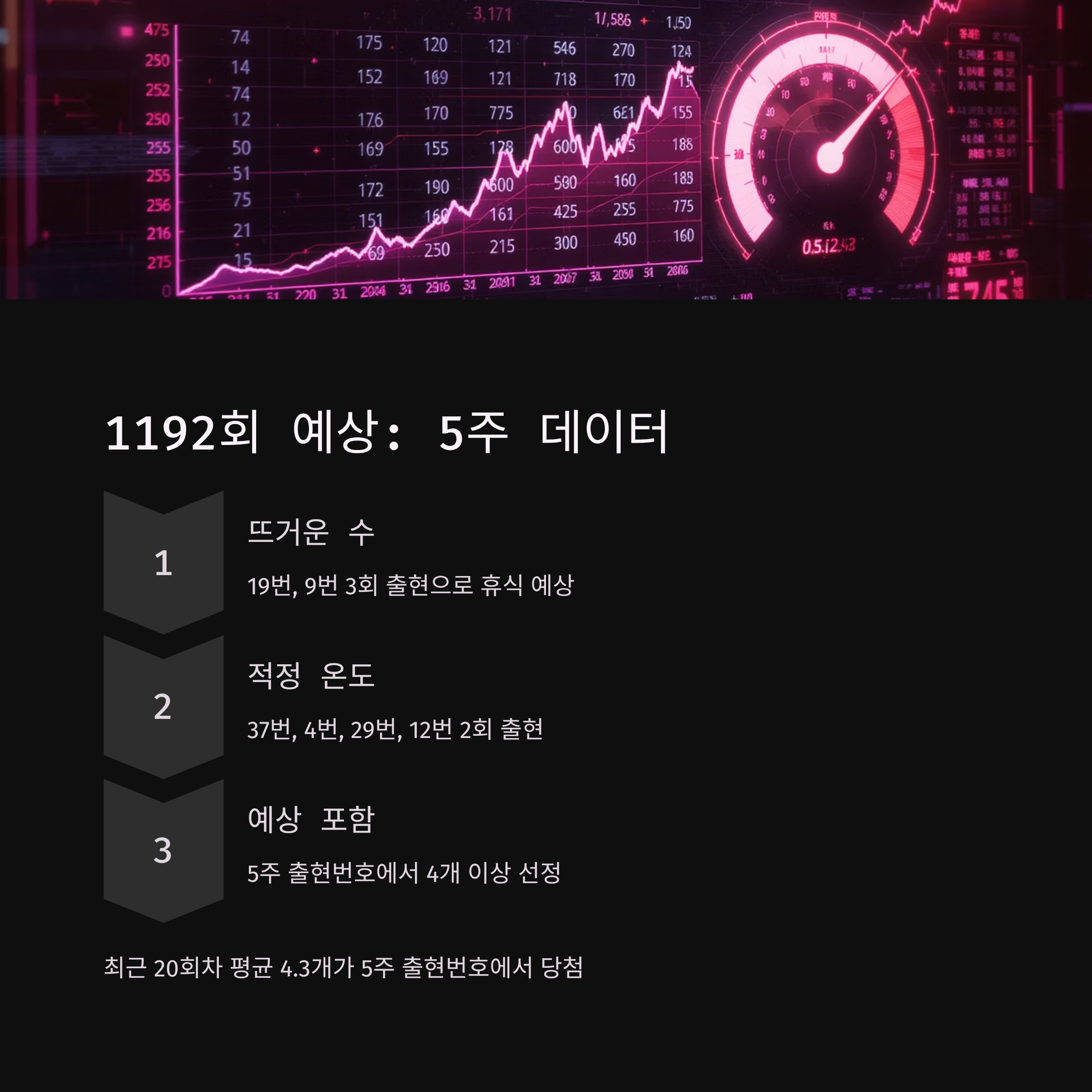 최근 5주 데이터를 종합 분석한 결과, 1192회에는 5주간 출현번호에서 4개 이상이 나올 것으로 예상됩니다.