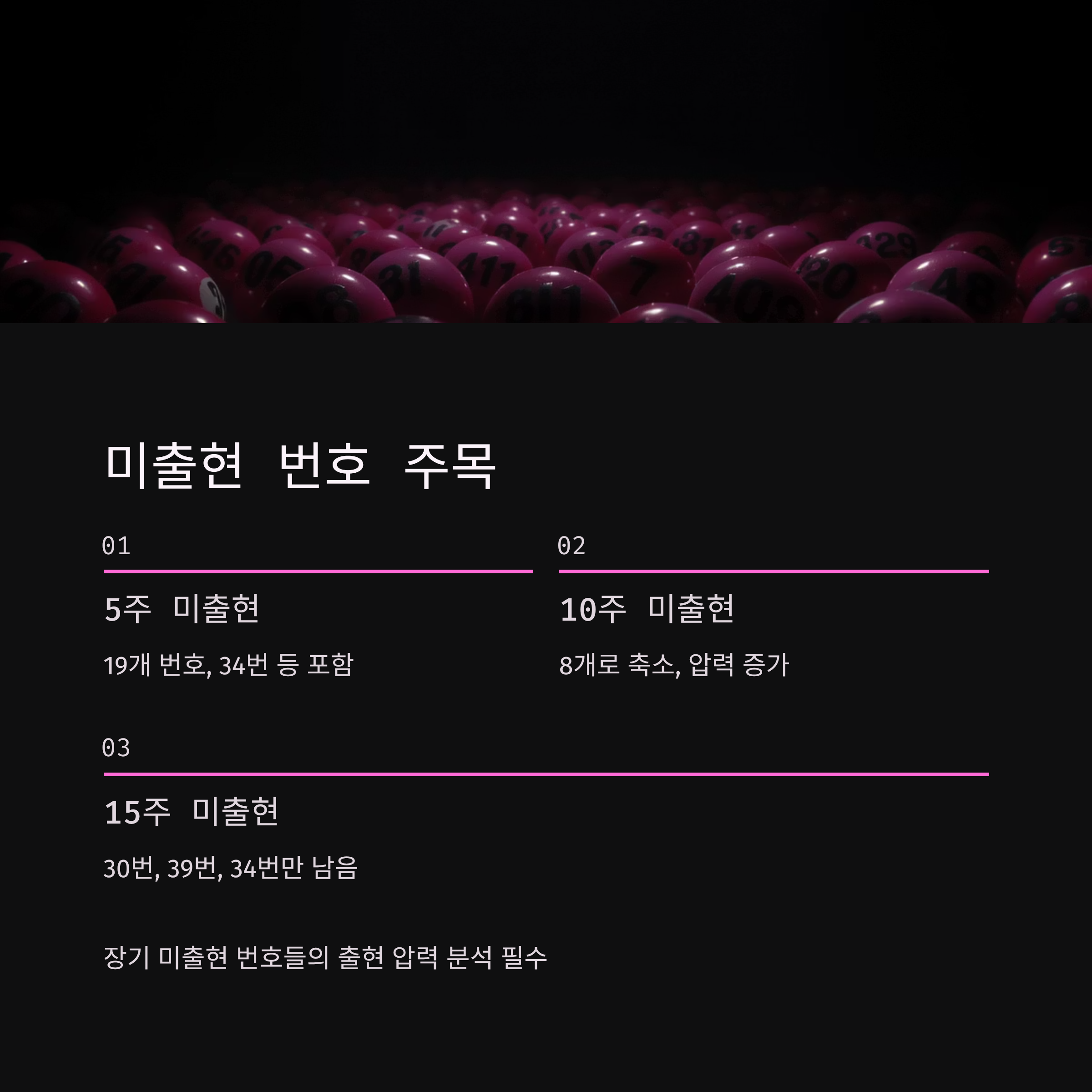4회 출현한 3번, 31번, 37번, 16번, 19번, 28번, 23번은 충분한 출현을 보였기 때문에 잠시 휴식기를 가질 가능성이 있습니다. 반면 1회만 출현한 24번, 45번, 36번, 32번, 10번은 출현 압력이 높아지고 있습니다.