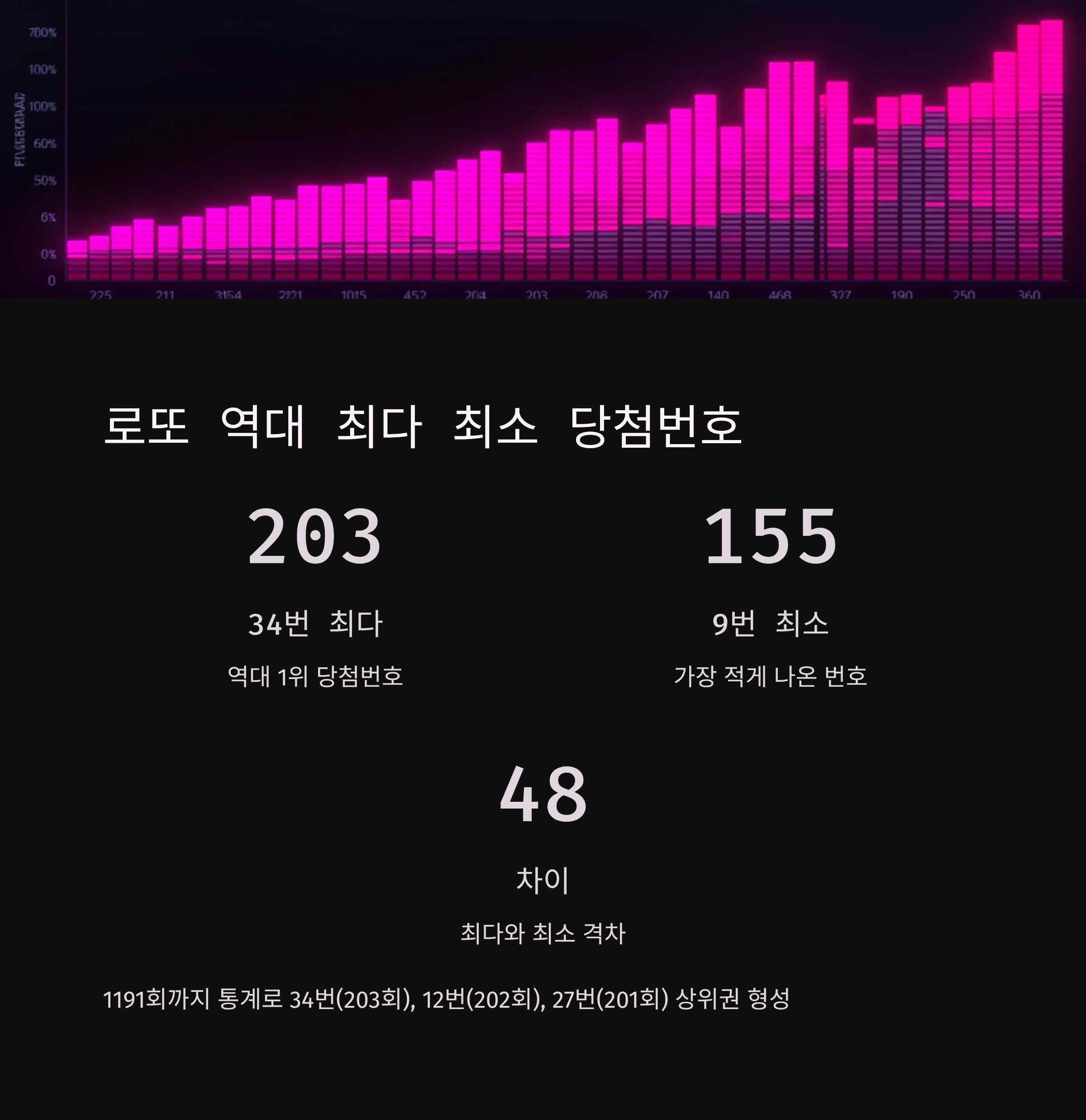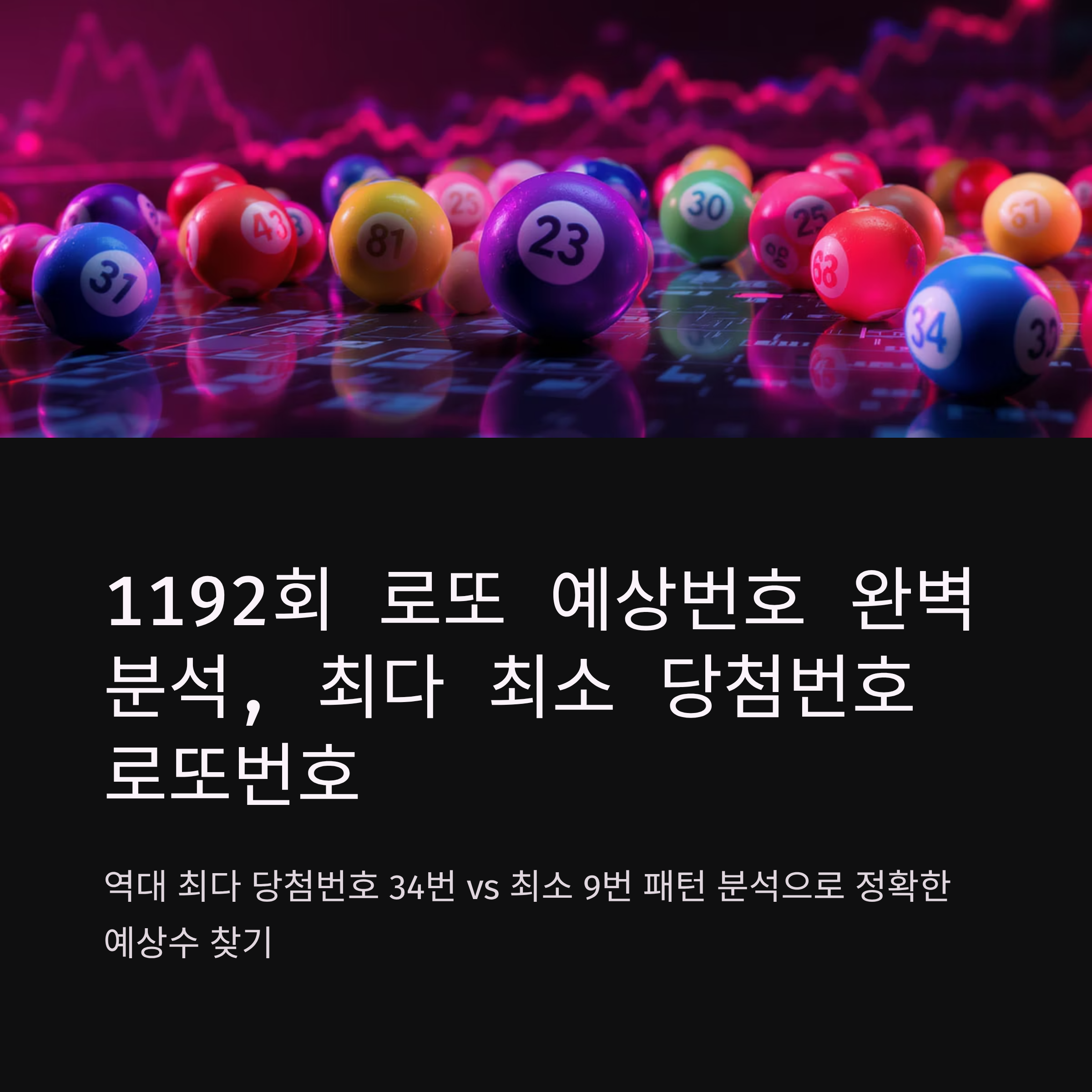 로또 역대 최다 당첨번호와 최소 당첨번호를 알고 계신가요? 1192회 로또 예상번호를 정확히 분석하려면 로또번호 가장 많이 나온 숫자와 가장 적게 나온 숫자의 패턴을 이해해야 합니다. 1191회까지의 통계를 보면 역대 최다 당첨번호 1위는 34번으로 203회, 최소 당첨번호는 9번으로 155회만 출현했습니다. 이번 1192회 로또당첨번호 예상수를 선정하기 위해 최근 5주와 15주 데이터를 집중 분석했습니다.