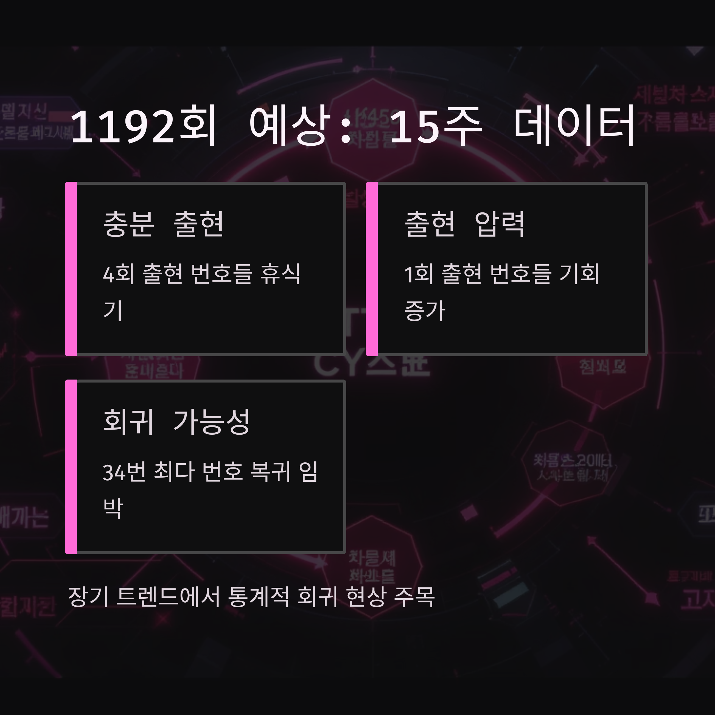 1192회 로또 예상번호 분석을 통해 역대 최다 당첨번호인 34번이 15주 이상 미출현 상태로 출현 압력이 매우 높다는 것을 확인했습니다.