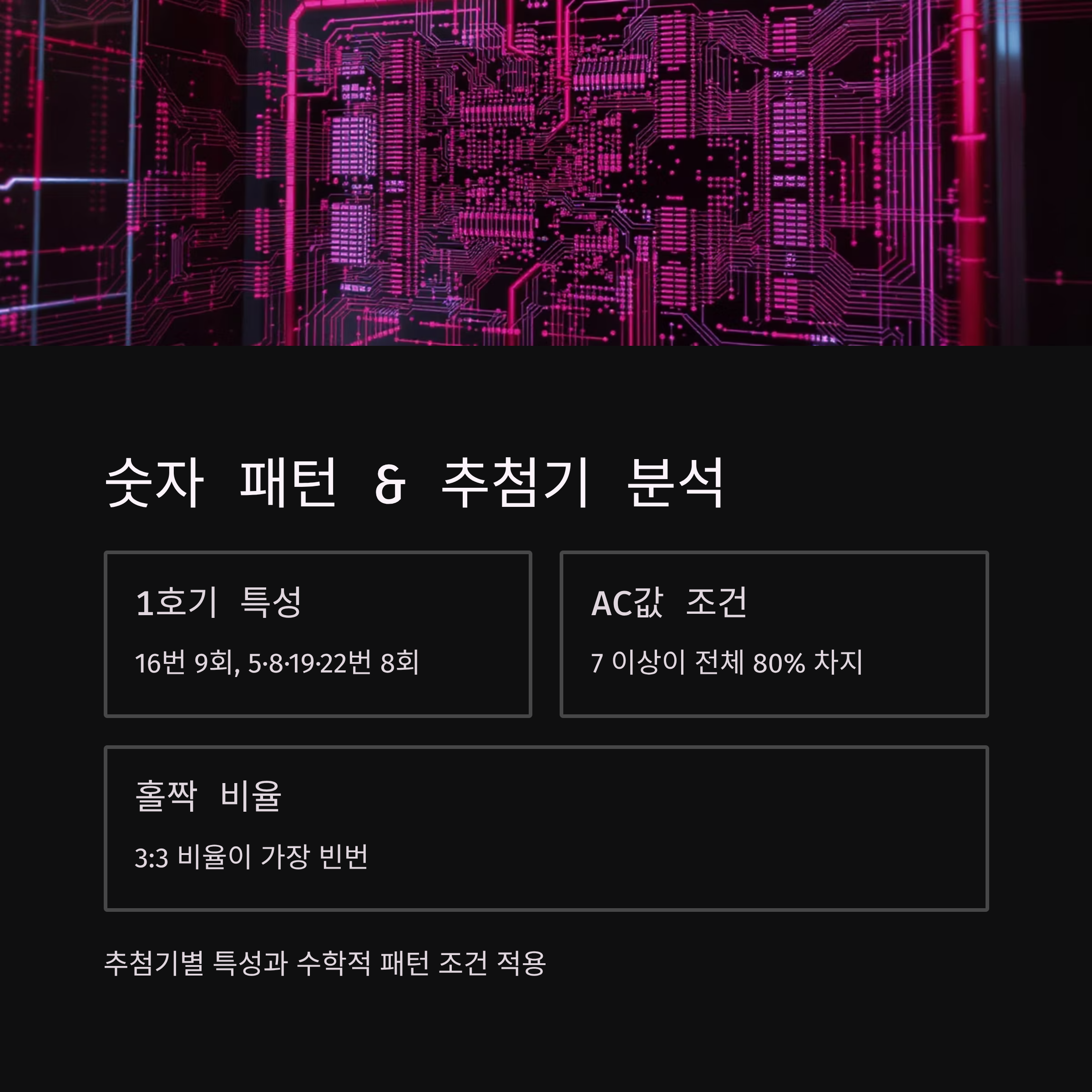AC값 분석에서는 7 이상의 값이 전체 당첨번호의 80%를 차지합니다. 홀짝 비율은 3:3이 가장 많이 나오며, 연속번호는 없거나 2연번 정도가 90% 이상을 차지합니다. 끝수 총합은 13~37 구간에 90%가 분포하고, 총합은 101~176 구간에 대부분 포함됩니다.