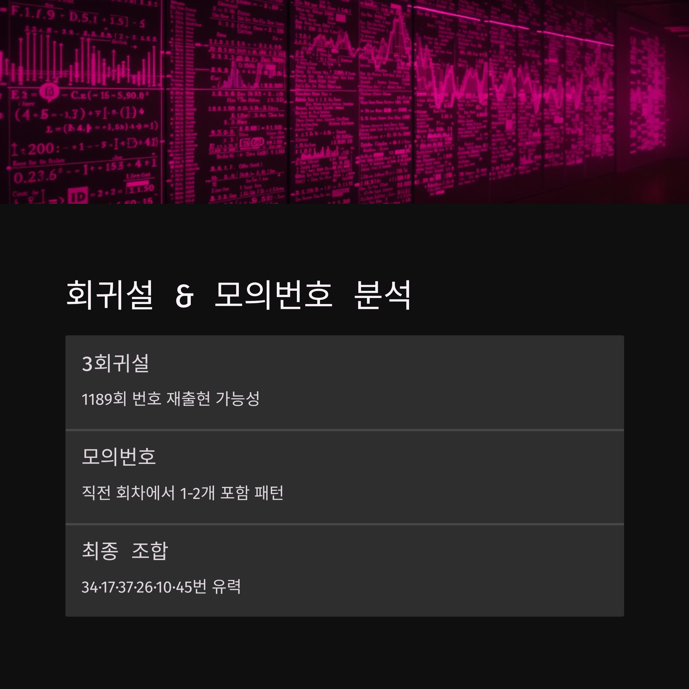 3회귀설을 적용하면 1189회(3주 전) 당첨번호인 9, 19, 29, 35, 37, 38번 중 일부가 재출현할 가능성이 있습니다. 실제로 최근 데이터를 보면 3~6회차 간격으로 동일 번호가 재출현하는 경우가 빈번했습니다.