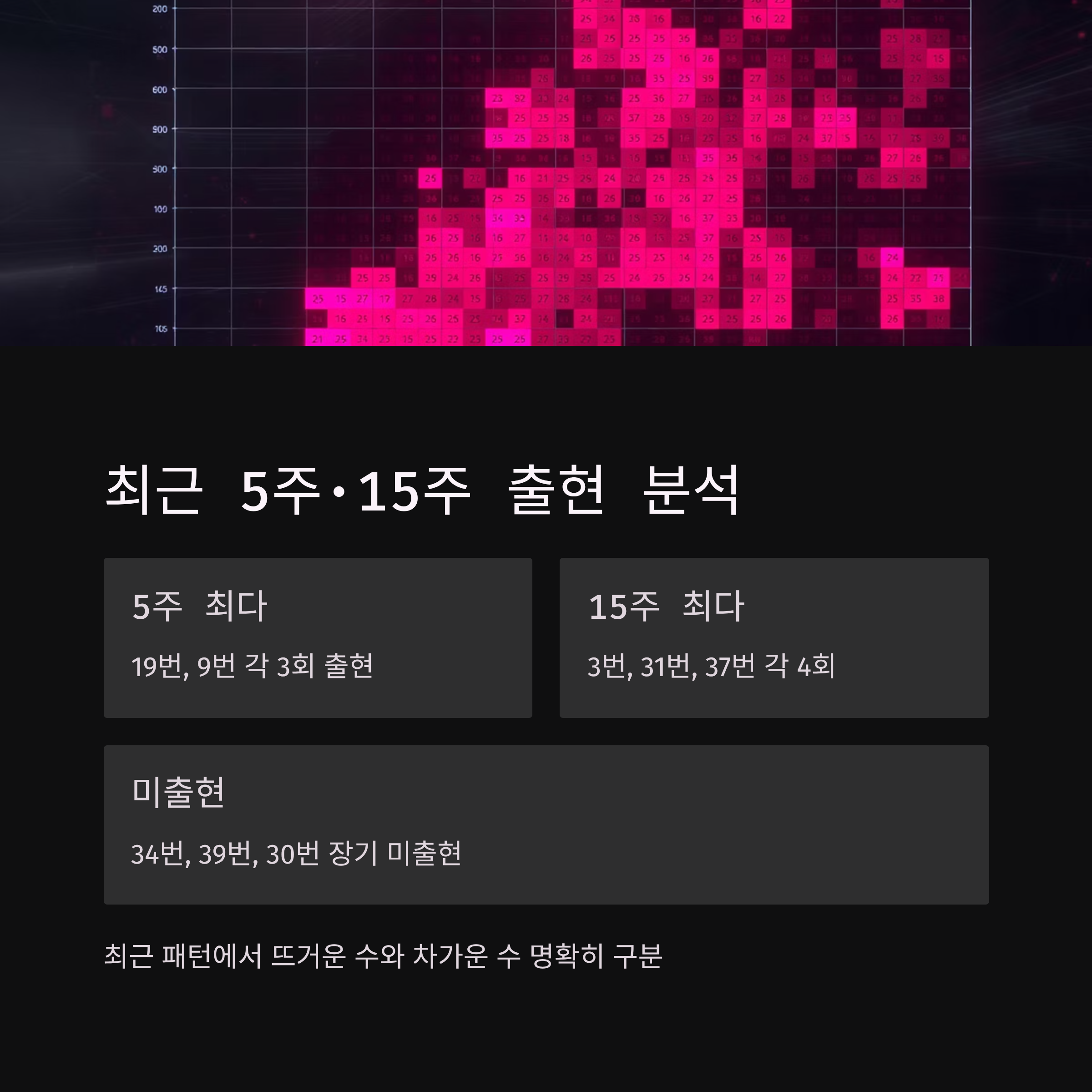 15주간으로 기간을 확대하면 더 명확한 패턴이 드러납니다. 3번, 31번, 37번, 16번, 19번, 28번, 23번이 각각 4회로 최다 출현했고, 9번, 17번, 6번, 4번, 40번, 21번, 29번, 22번, 12번, 27번, 13번, 41번이 3회씩 나왔습니다. 반면 30번, 39번, 34번은 15주 동안 단 한 번도 출현하지 않아 장기 미출현 번호로 분류됩니다.