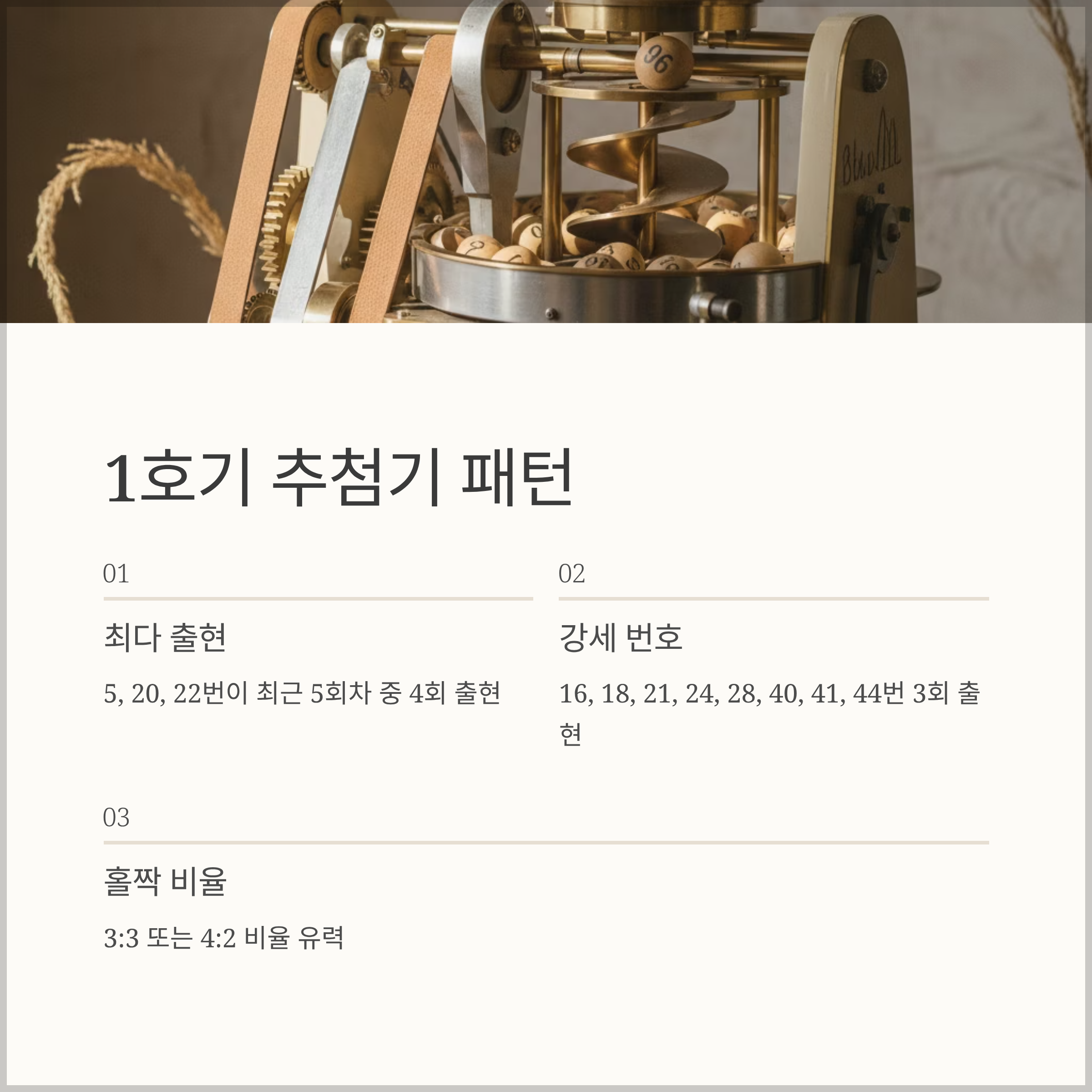1호기 추첨기 데이터를 보면 최근 5회차까지 5, 20, 22번이 4회로 가장 많이 출현했습니다. 16, 18, 21, 24, 28, 40, 41, 44번이 3회씩 나왔습니다.