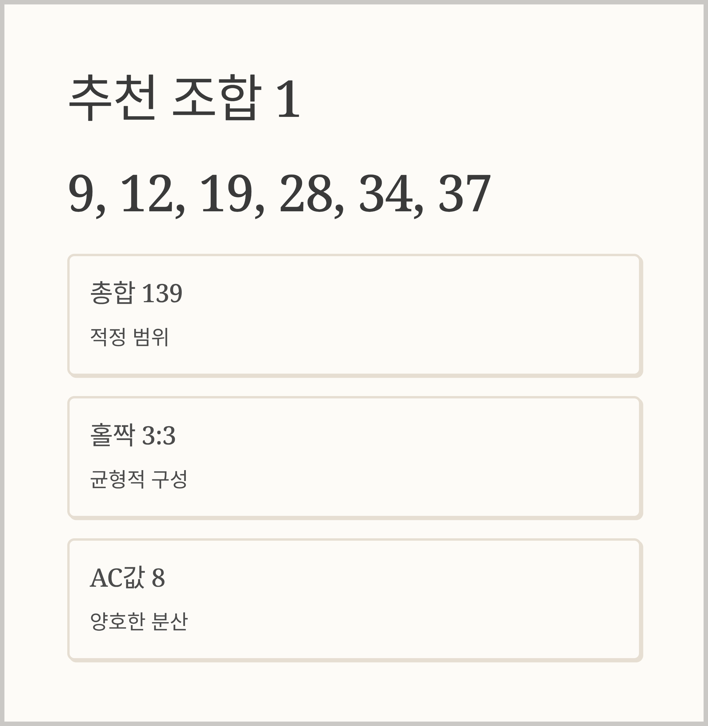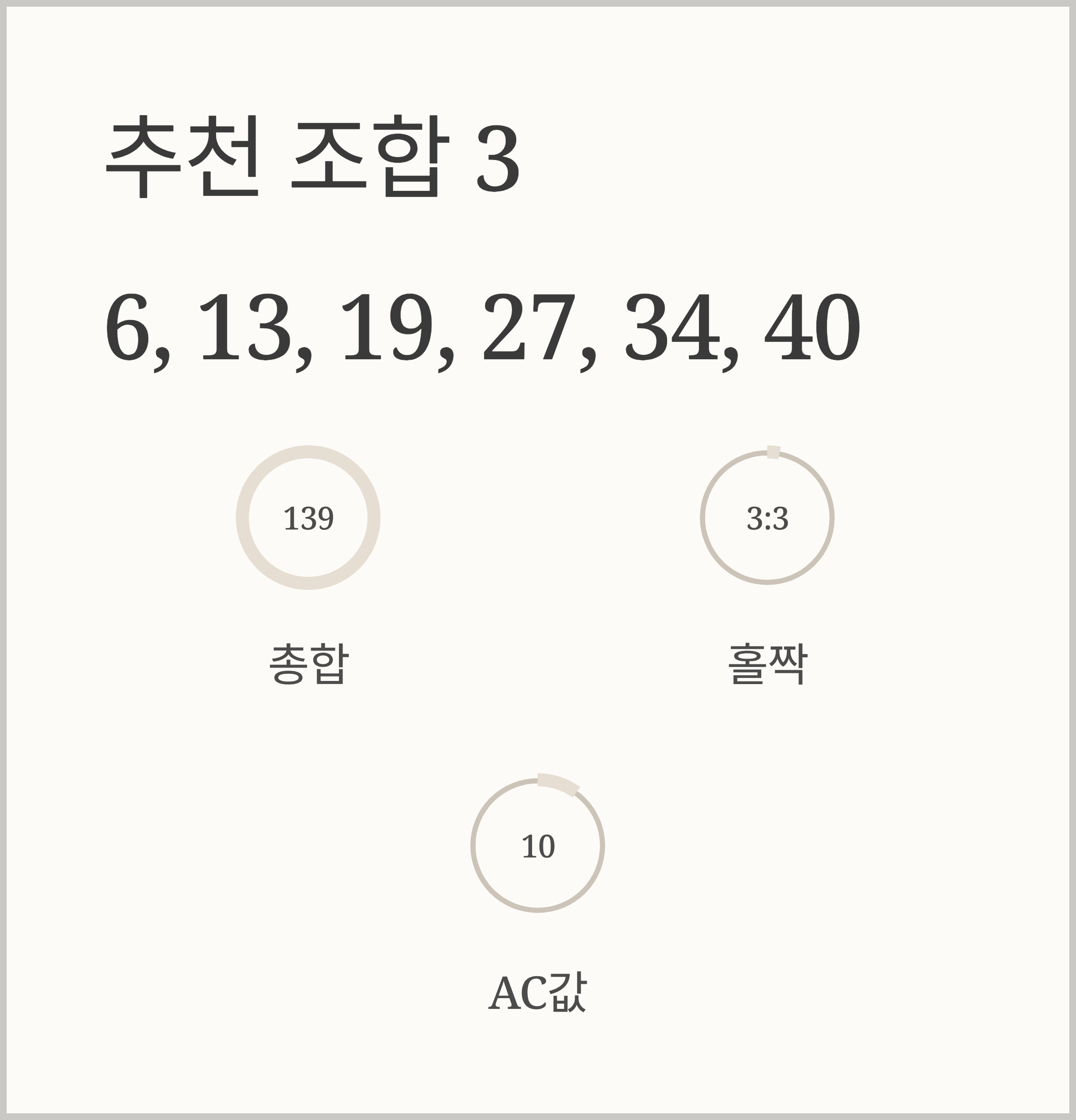 이 조합은 총합이 139로 적정 범위이며, 홀짝 비율 3:3, 고저 비율 3:3으로 균형적입니다. AC값은 8로 양호합니다.