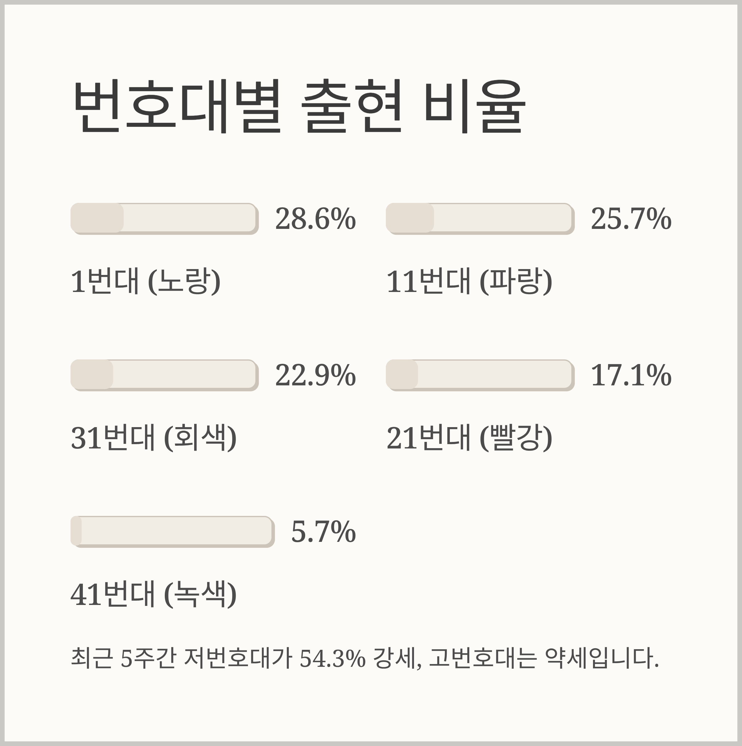1번대와 11번대가 전체의 54.3%를 차지하여 저번호대가 강세를 보입니다. 반면 41번대는 5.7%에 불과해 고번호대가 약세입니다.
