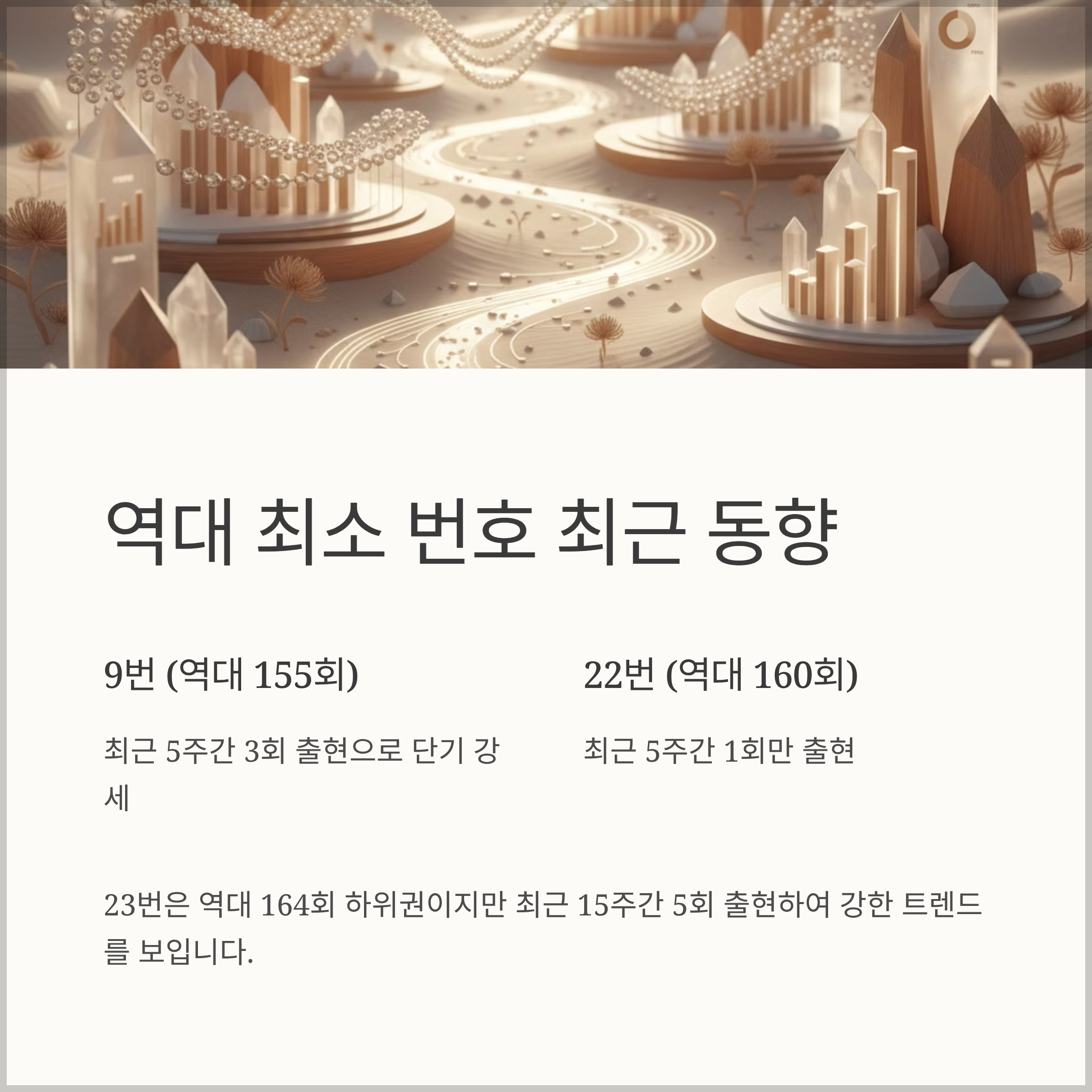 23번은 역대 164회로 하위권이지만 최근 15주간 5회 출현하여 최근 트렌드가 강합니다. 1192회에도 당첨되어 연속 출현 가능성을 보여줍니다.
