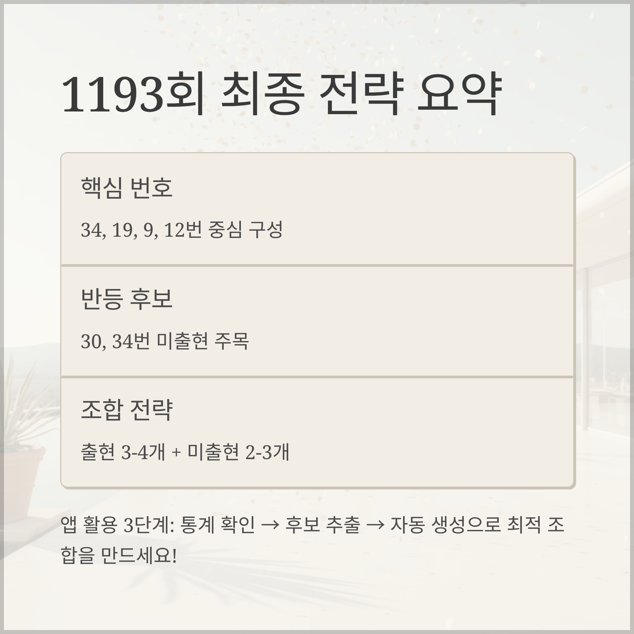 앱의 번호별 통계, 출현번호 통계, 미출현번호 통계 기능을 통해 1193회 로또 예상번호를 체계적으로 도출할 수 있습니다.