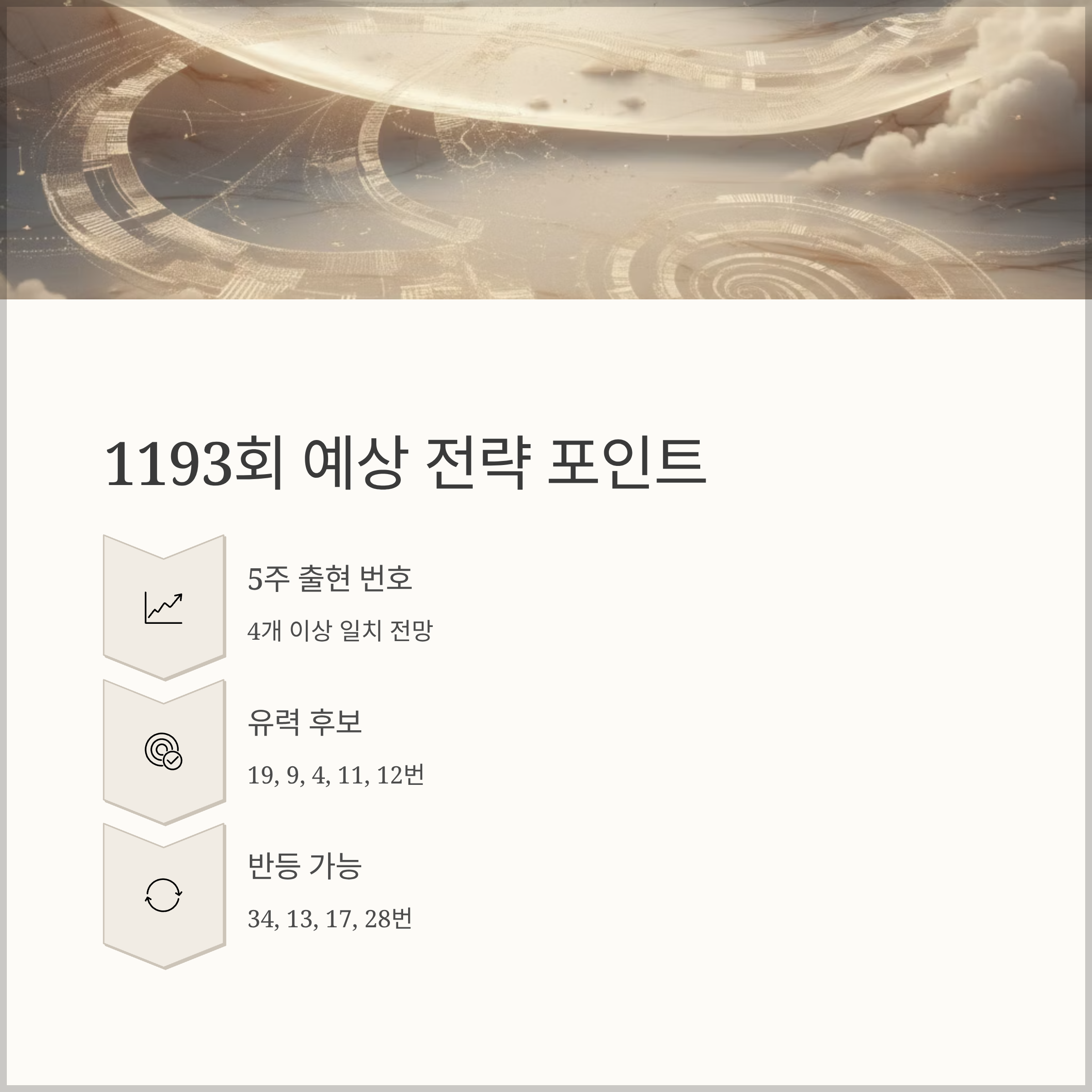 1193회 로또 예상번호는 역대 최다 당첨번호 34번과 최근 강세를 보이는 19, 9, 12번을 중심으로 구성하는 것이 효과적입니다. 15주간 미출현인 30번과 34번도 반등 가능성이 있어 고려할 만합니다.