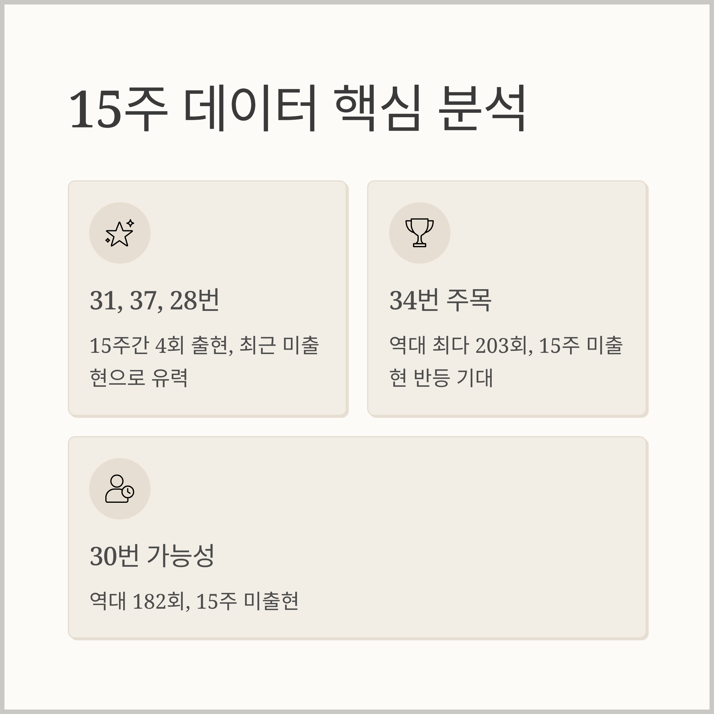 15주 기준으로는 미출현 번호가 30번과 34번 단 2개뿐입니다. 특히 34번은 역대 최다 당첨번호임에도 15주 동안 나오지 않아 다음 추첨에서 출현 가능성이 높아지고 있습니다.