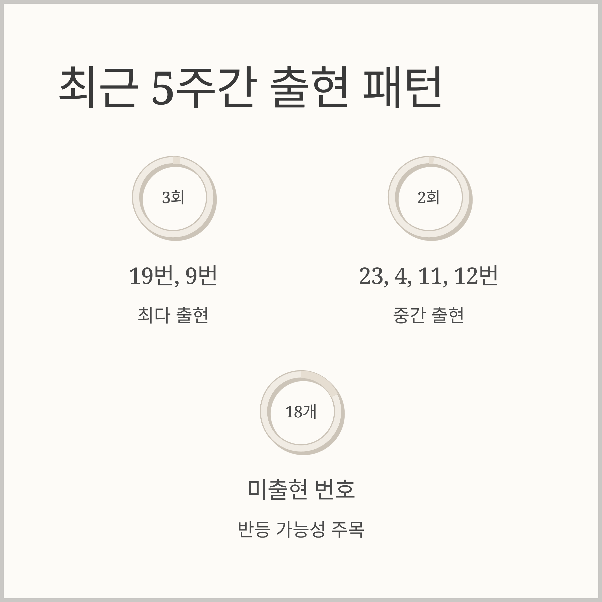 5주간 출현 번호 중에서 19, 9번이 3회로 가장 높고, 23, 4, 11, 12번이 2회입니다. 이 중 23번은 1192회에 나왔으므로 연속 출현 가능성은 낮습니다. 19, 9, 4, 11, 12번이 유력한 후보입니다.