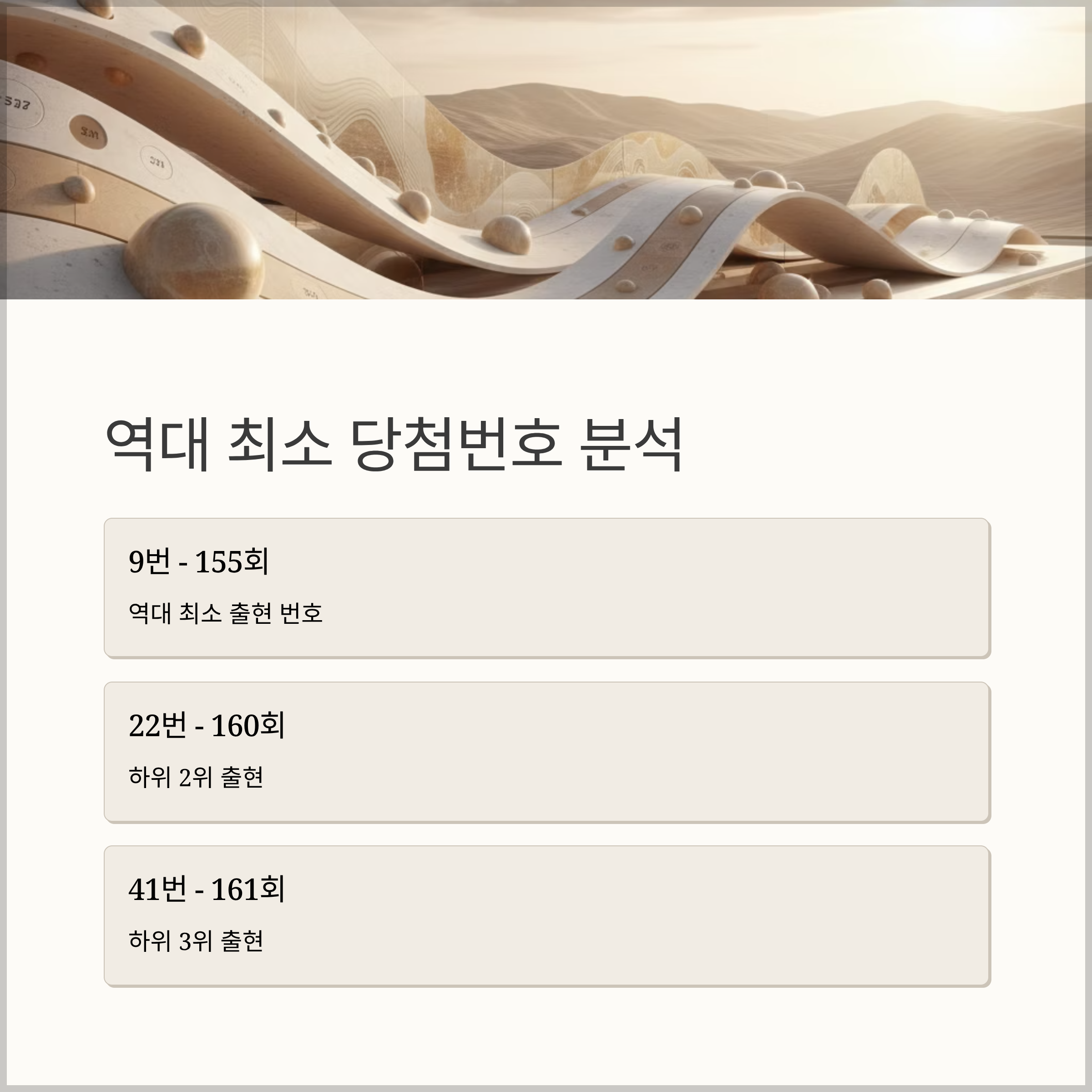 역대 최소 당첨번호인 9번은 총 155회만 출현했지만, 최근 5주간 3회나 나와 단기적으로는 활발한 모습을 보입니다.