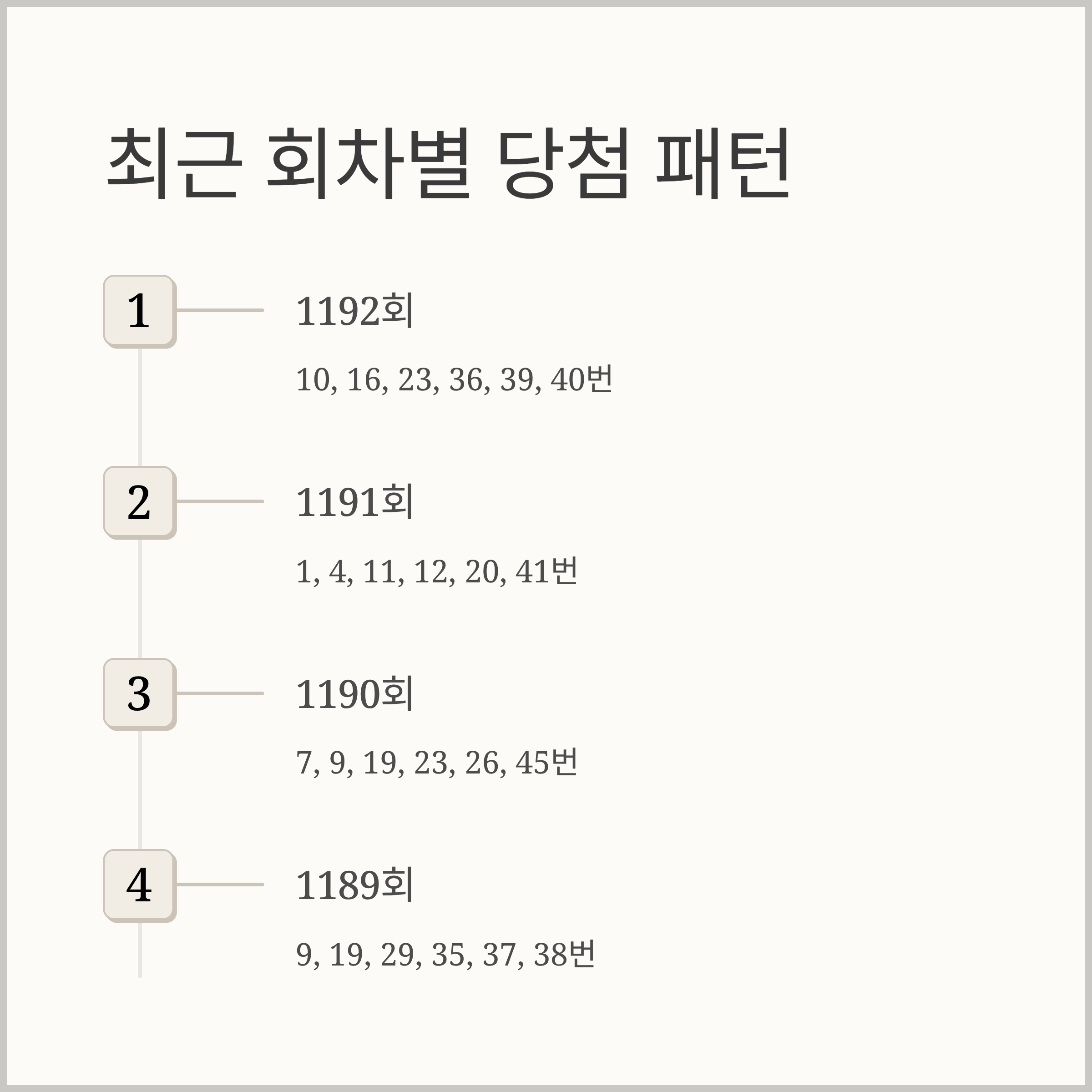 1191회는 1, 4, 11, 12, 20, 41번이 나왔습니다. 1190회는 7, 9, 19, 23, 26, 45번이었습니다. 1189회는 9, 19, 29, 35, 37, 38번으로 19번과 9번이 연속 출현했습니다.