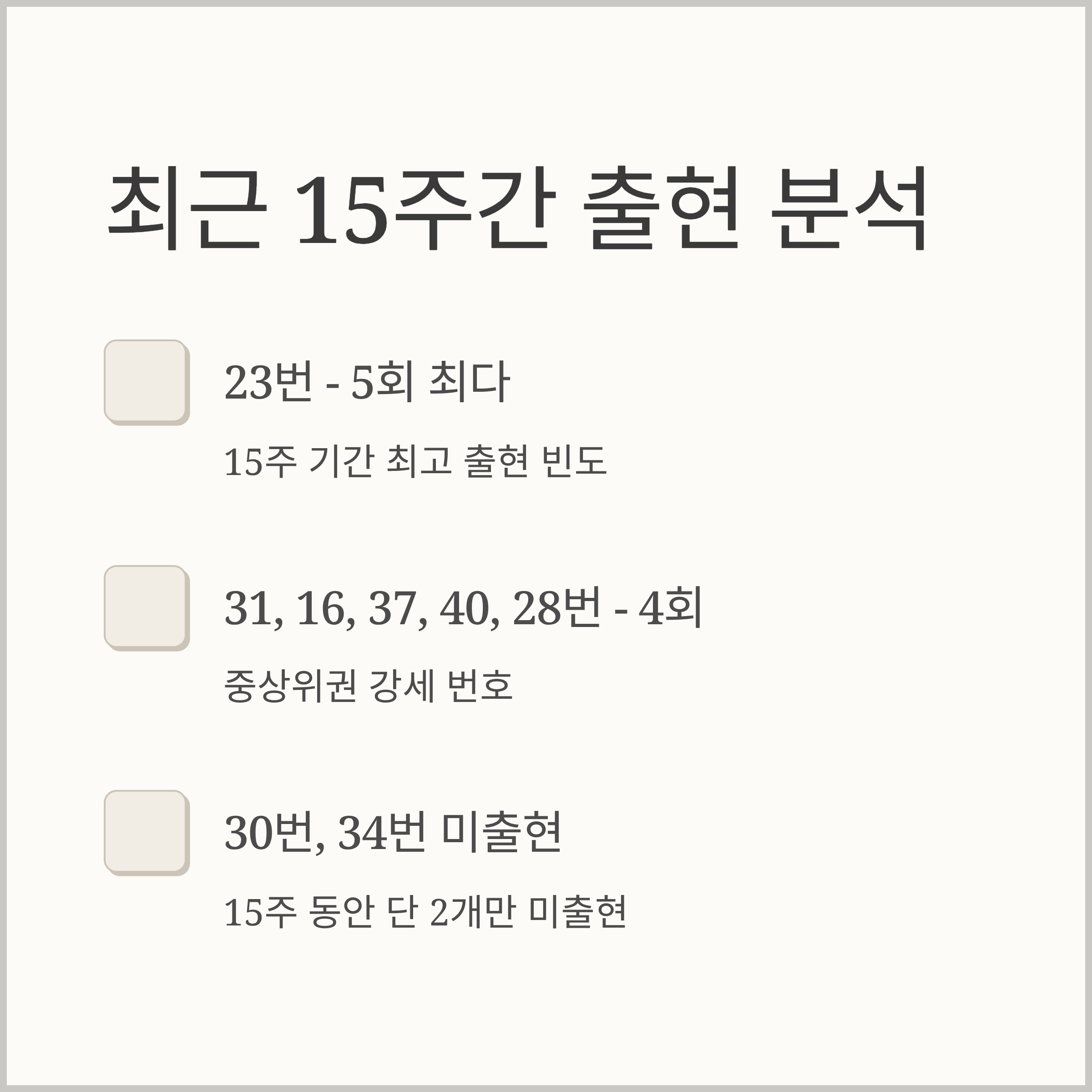 31, 37, 28번은 15주간 4회 출현하고 최근에는 나오지 않아 다음 추첨 후보로 적합합니다. 3, 11, 17, 6, 4, 19, 29, 22, 9, 12, 27, 13, 41번도 3회 출현으로 중간 빈도를 보입니다.
