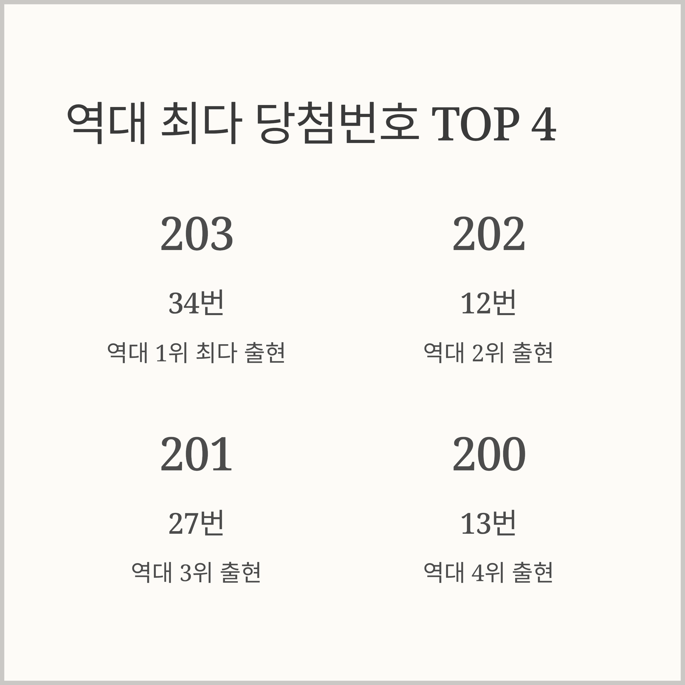 가장 많이 나온 숫자는 34번으로 총 203회 출현했습니다. 그 뒤를 이어 12번이 202회, 27번이 201회, 13번이 200회 순으로 나타났습니다.