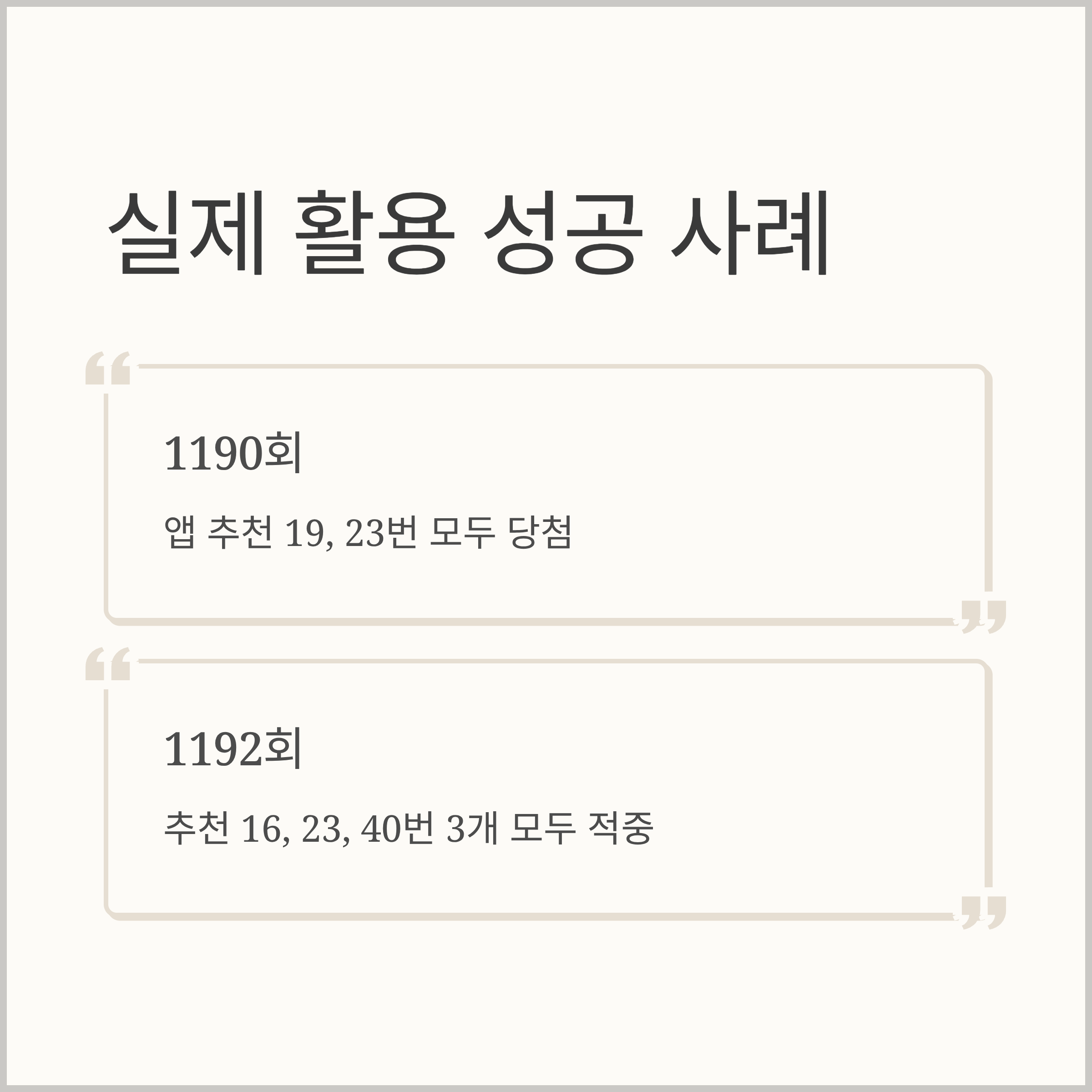 1192회에는 앱에서 추천한 16, 23, 40번을 포함하여 조합을 만들었는데, 세 번호가 모두 실제 당첨번호에 포함되어 놀랐습니다. 앱의 통계 분석 기능이 실제로 유용하다는 것을 확인했습니다.