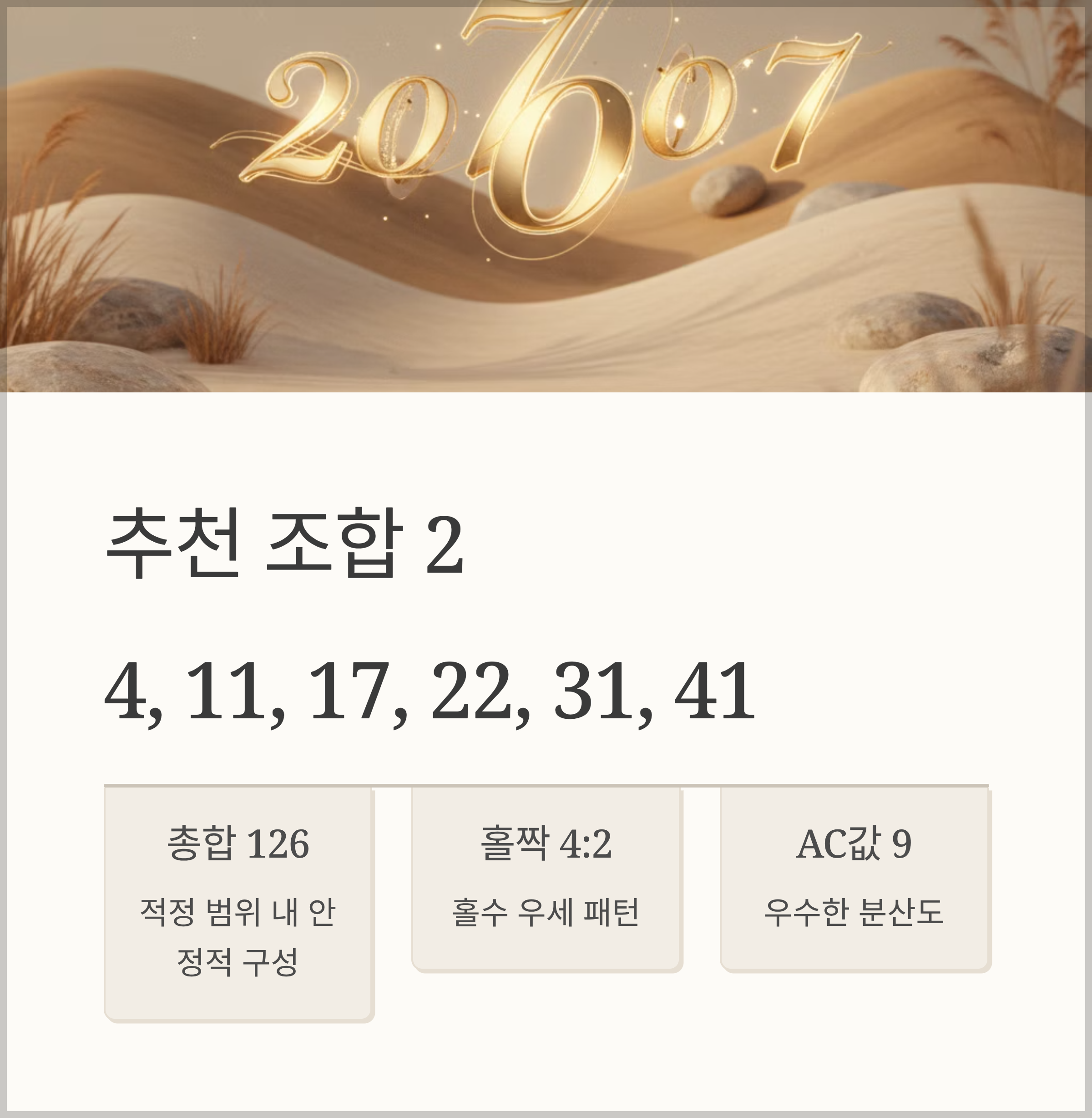 이 조합은 총합이 126으로 적정 범위이며, 홀짝 비율 4:2, 고저 비율 2:4로 고번호대가 우세합니다. AC값은 9로 우수합니다.