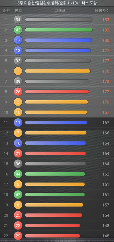 5주간 당첨되지 않은 번호에서 현재까지 누적 당첨횟수가 많은 순서로 정렬하여 로또 예상 번호를 선택합니다.