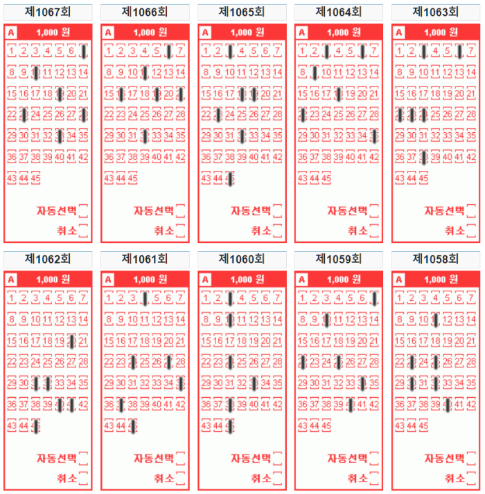 1067회 로또번호까지 로또용지에 표시한 자료입니다.