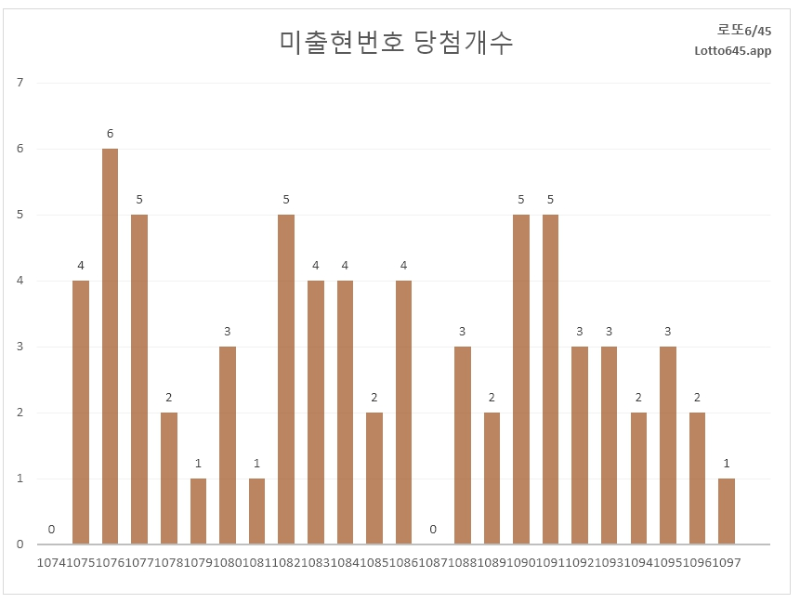 최근 1097회차 당첨번호는 직전 5주 미출현에서 1개 번호만 나왔다는 사실입니다.