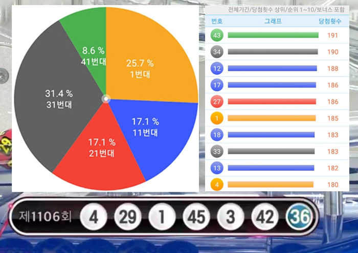 1107회 로또 복권 당첨번호 예상 분석은 1106회 로또당첨번호 분석으로 시작합니다. 1106회차에서는 1, 3, 4, 29, 42, 45가 1등 당첨번호로 발표되었고, 보너스 번호는 36이었습니다. 당첨결과를 분석하여 1107회 로또 예상번호를 심층 분석하여 제시하고자 합니다.