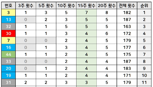 15주 동안의 데이터를 보면, 3번이 7회, 13번이 5회, 32번이 5회, 30번이 4회, 7번이 4회 당첨되었어요. 따라서, 이 번호들을 여러분의 로또 번호에 포함시켜보세요.