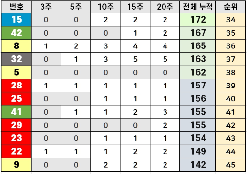 30번대와 40번대의 번호가 상위권에 많이 포진해 있어, 이 구간의 번호들을 주의 깊게 살펴보는 것이 좋습니다. 통계적으로 많이 나온 번호들이 계속해서 나올 확률이 높기 때문에, 이 번호들을 고려한 조합을 만들어보는 것이 당첨 확률을 높이는 데 도움이 됩니다.
