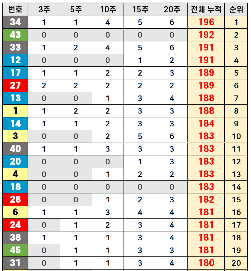 • 1회 출현: 34, 30, 6, 21, 40, 8, 24, 11, 19, 14, 17, 25, 37, 22, 38, 31, 45, 32, 16, 2
