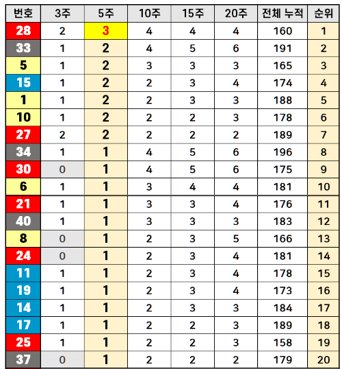 • 28 (최근 5주 3회 출현, 뜨거운 숫자)