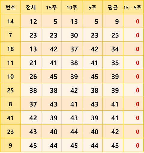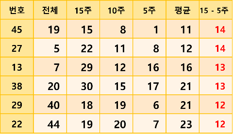 로또번호 45개 중에서 최근 15주간 출현 순위에서 5주간 출현 순위로 증가된 번호들만 가져왔습니다. 순위변동 없는 숫자도 포함했습니다.