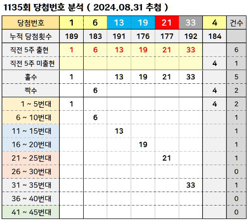 1135회 로또 당첨번호를 살펴보면, 1, 6, 13, 19, 21, 33 순서로 나왔어요. 보너스 번호는 4였구요. 이 번호들을 자세히 들여다보면 재미있는 패턴들이 보여요. 예를 들어, 1번과 6번이 연속으로 나왔고, 그 다음에는 10번대 숫자인 13번이 나왔어요. 그리고 다시 10번대 숫자인 19번, 20번대 숫자인 21번, 그리고 마지막으로 30번대 숫자인 33번이 나왔네요.