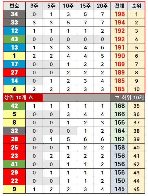 - 34번: 역대 최다 당첨 횟수(198회)를 기록한 숫자로, 15주간에도 5회 출현