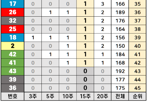 10주 기준으로는 11번, 8번, 17번, 32번, 25번, 43번, 39번, 36번이 한 번도 출현하지 않았습니다.