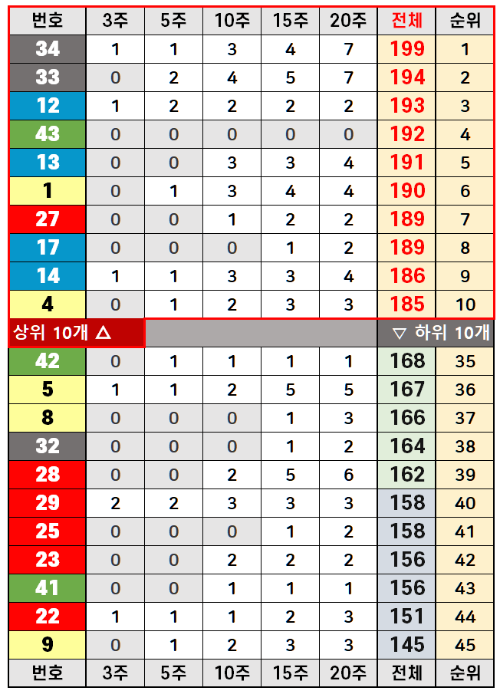 5주로 범위를 좁히면 미출현 번호가 17개로 늘어나는데, 이는 6번, 13번, 28번, 23번, 24번, 27번, 3번, 2번, 41번, 11번, 8번, 17번, 32번, 25번, 43번, 39번, 36번입니다. 이러한 데이터는 '회귀 평균' 이론에 따라 향후 당첨 가능성이 높아질 수 있는 번호들을 식별하는 데 도움이 됩니다.