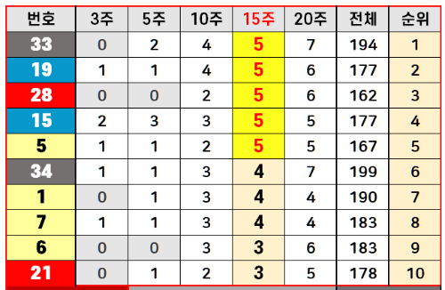 로또번호 가장 많이 나온 숫자 (5주, 15주)