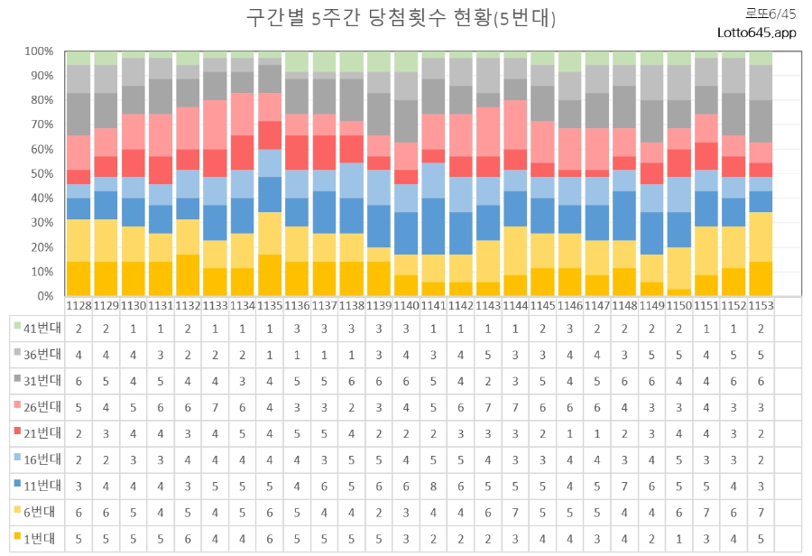 '출현번호 통계' 메뉴에서는 번호대별 출현 패턴을 분석할 수 있습니다. 번호대는 10번대(1 ~10, 11 ~ 20 등)와 5번대(1 ~ 5, 6 ~ 10 등)로 구분하여 볼 수 있어 번호대별 출현 경향을 파악하기 좋습니다.