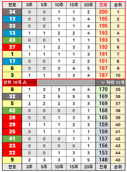 - 20, 41번: 10주간 한 번도 출현하지 않음