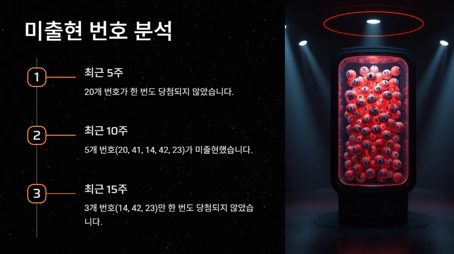 미출현번호인 14번, 42번, 23번은 15주 동안 한 번도 당첨되지 않았습니다. 이렇게 오랫동안 나오지 않은 번호들은 다음 회차에 출현할 가능성이 높아집니다.