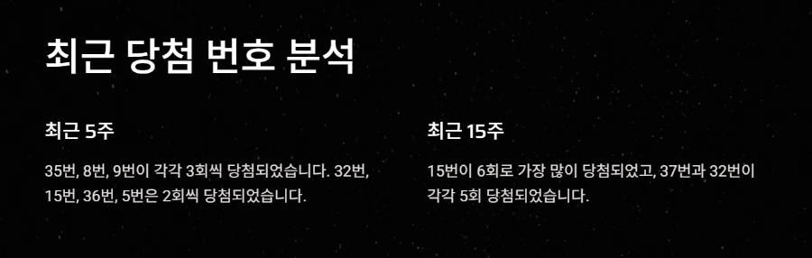 5주간 자주 당첨된 35번, 8번, 9번은 각각 3회씩 당첨되어 핵심 후보번호로 볼 수 있습니다. 이 번호들은 짧은 기간에 집중적으로 나온 번호들이라 주목할 필요가 있죠.