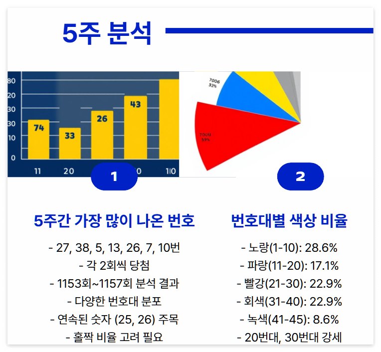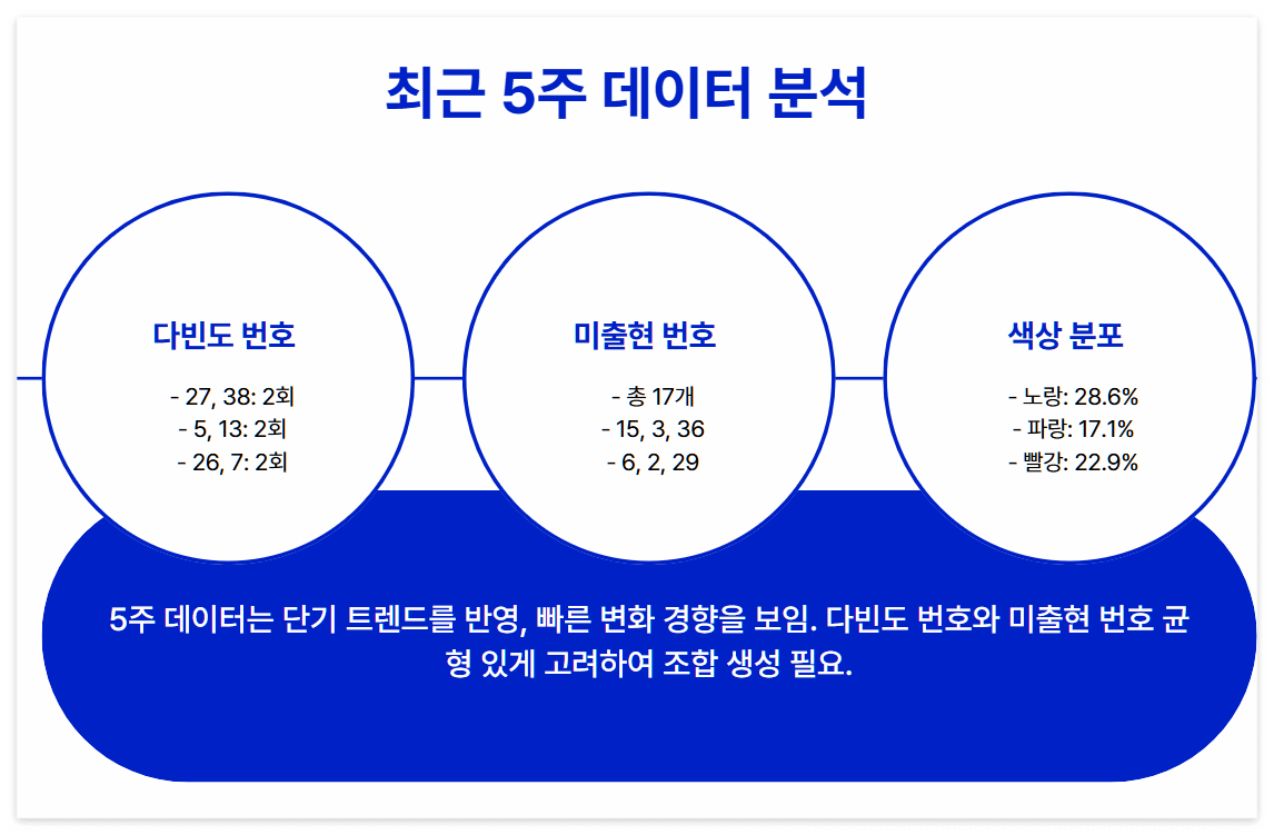 최근 5주간 데이터 분석 결과는 당첨횟수 2회 이상으로 27, 38, 5, 13, 26, 7, 10번이 두드러집니다. 이 데이터는 단기간의 트렌드를 반영하여 빠르게 변화하는 경향을 보여줍니다.