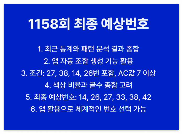 1158회 예상번호는 다음과 같은 조건들을 종합적으로 고려하여 생성해보았습니다: