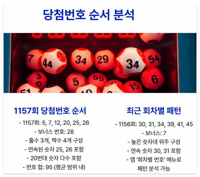 1157회 당첨번호는 5, 7, 12, 20, 25, 26(보너스 28)으로 구성되어 있습니다. 최근 회차별로 번호가 어떻게 배열되었는지 확인할 수 있습니다.